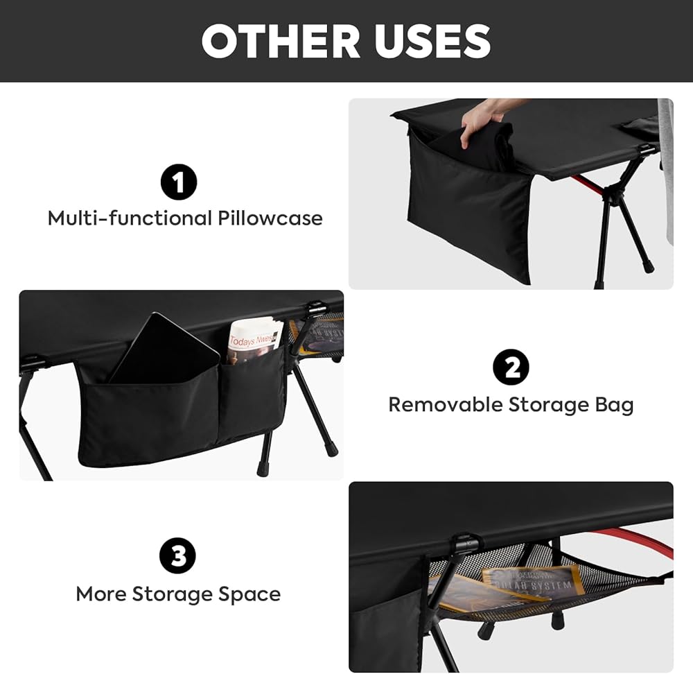 Two Height Mode Foldable Cots: The height of high mode is 16.5 inches (42 cm), resembling a regular bed, perfect for use on damp ground or as a long chair. The low mode is 7.9 inches (20 cm), ideal for tents or solid ground. This design ensures optimal sleep quality in any environment, catering to different terrains and personal preferences.