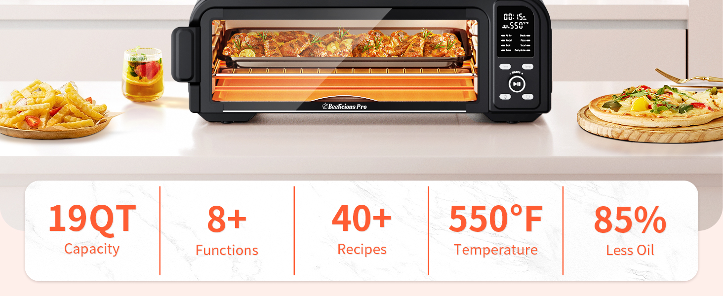 Beelicous Pro 19QT Digital 8-in-1 Air Fryer Toaster Oven, 550°F Flavor-Lock Tech, Flip Up & Away Capability, 40+ Recipes, Airfryer Countertop Oven Combo, 4 Accessories, Fit 13" Pizza, Black