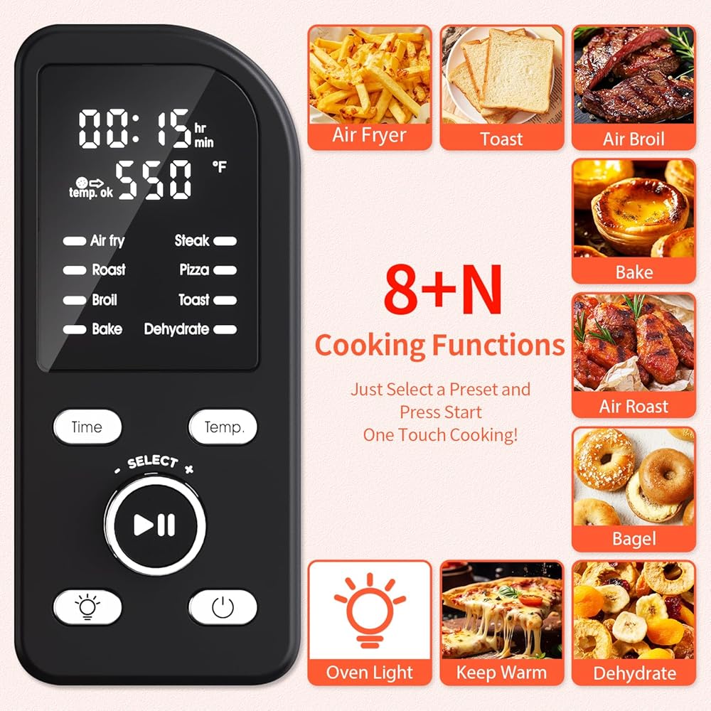 【 8-in-1 Versatility】 One-touch cooking functions on a digital display. Air Fry, Roast, Broil, Bake, Steak, Pizza, Toast and Dehydrate all in one powerful.