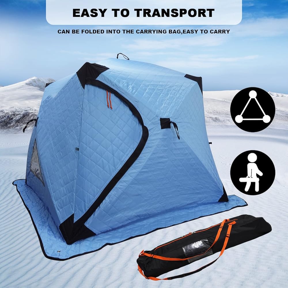 Easy to Carry — The Ice fishing shelter comes with a carry bag, portable to take the ice fishing tent outdoor for fishing and camping. It contains steaks to hold the tent down and a traveler bag to easily transport the tent to wherever you want.