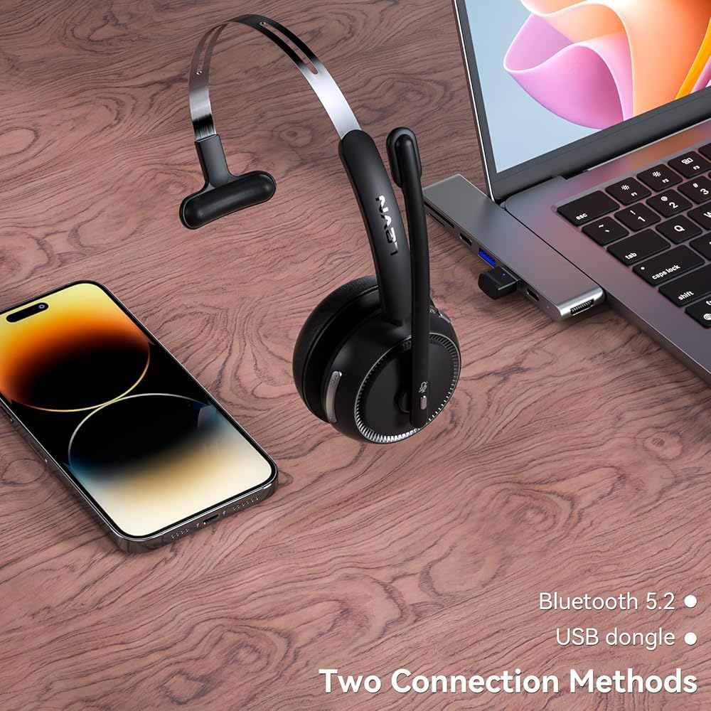 LEVN Bluetooth Headset, Wireless Headset with Microphone & Mute Button, 60Hrs Talk Time, On-Ear AI Noise Cancelling Headphones with Bluetooth 5.2 Multipoint for Trucker/Remote Work/Online Class/Zoom