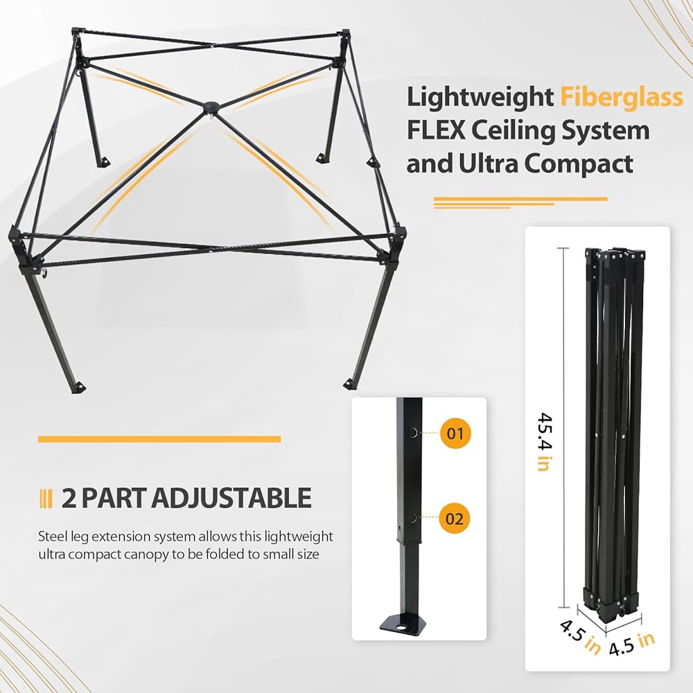 WHAT'S INCLUDED: 5x5 Pop-up Canopy Frame, 140g polyester top fabric, 140g polyester canopy sidewalls with easy-entrance zipper for complete enclosure, 2 mesh storage pockets sewn into the sidewall, 1 ceiling hook can hold up to 50 lbs, 1 carry bag.
