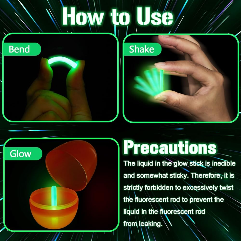 Warm Note: the liquid inside the glow sticks multicolor bulk is not edible and has a certain degree of adhesion, if leaked, it is easy to contaminate furniture, floors, clothing and skin, If the above situations occur, it is necessary to clean them in a timely manner; If the liquid enters the eyes, rinse with water or seek medical attention in a timely manner