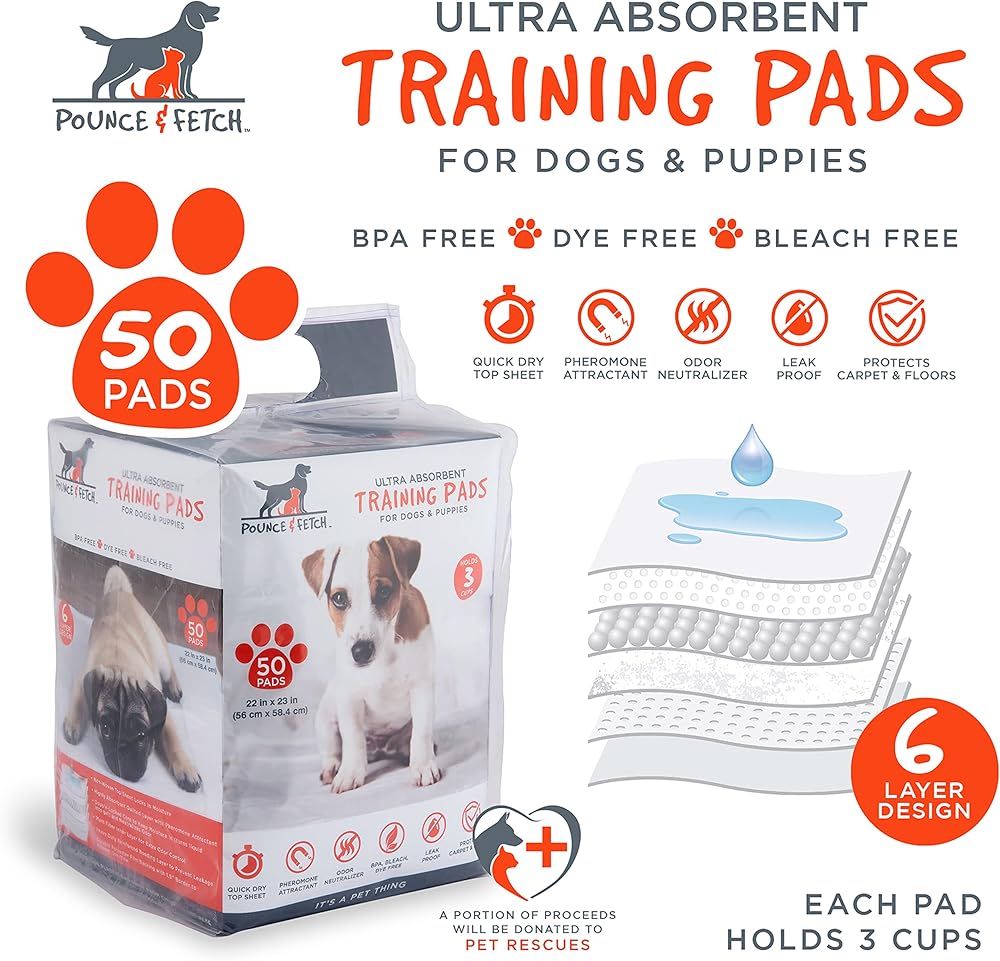 The Pounce + Fetch Dog Training Pads are designed to protect your floors and carpets from your puppy's bathroom mess. These 6-layer training pads are ultra-absorbent and leak proof to make sure your floors stay dry after inside accidents. They can hold up to 3 cups of fluid for potential multiple uses when need be. They have a quick dry top sheet that helps for an easy disposal of the pad, and they have an odor neutralizer, so you will not even smell that it's there. The pads are safe for you and your pet. They are BPA, dye, and bleach free. Perfect for dogs and puppies, these are a must have in your home.