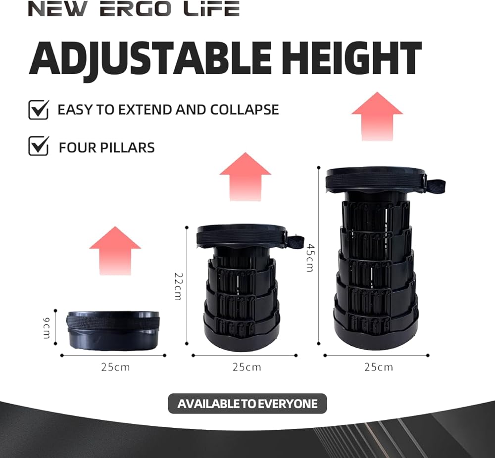 Foldable and Height-Adjustable: Effortlessly unfold and adjust the height of this camping stool within seconds, securing it in place with a simple rotation for quick setup. Its adjustable height ranges from approximately 9cm to 45cm, catering to both adults and children.