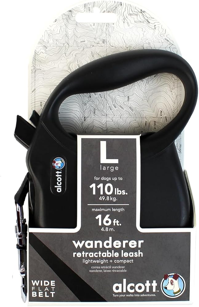 Our wanderer retractable leash is our most compact and lightweight leash model. Available in 3 sizes and 5 colors, each leash extends 16' long and has a wide, black belt. With an intuitive brake + lock mechanism, This leash is perfect for pets that want to get out and go!