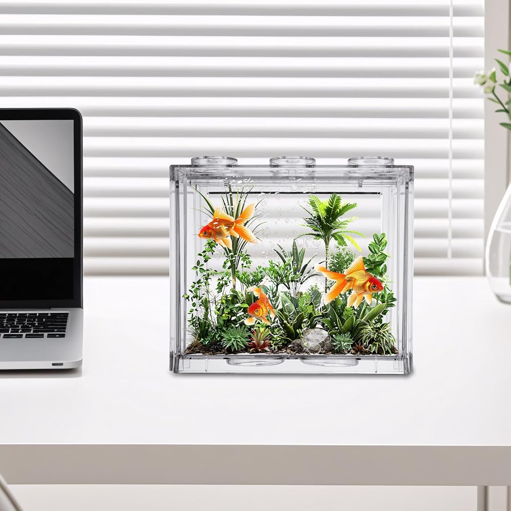 【Stackable】The appearance of fish tanks is designed with building blocks, which makes it can be stacked and placed or combined freely to add some scenery to your desk or room; the small goldfish tank measures about 6.3x5.5x4.1inch/16x14x10.5cm