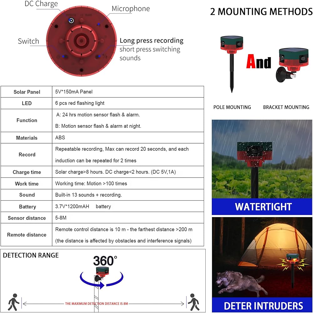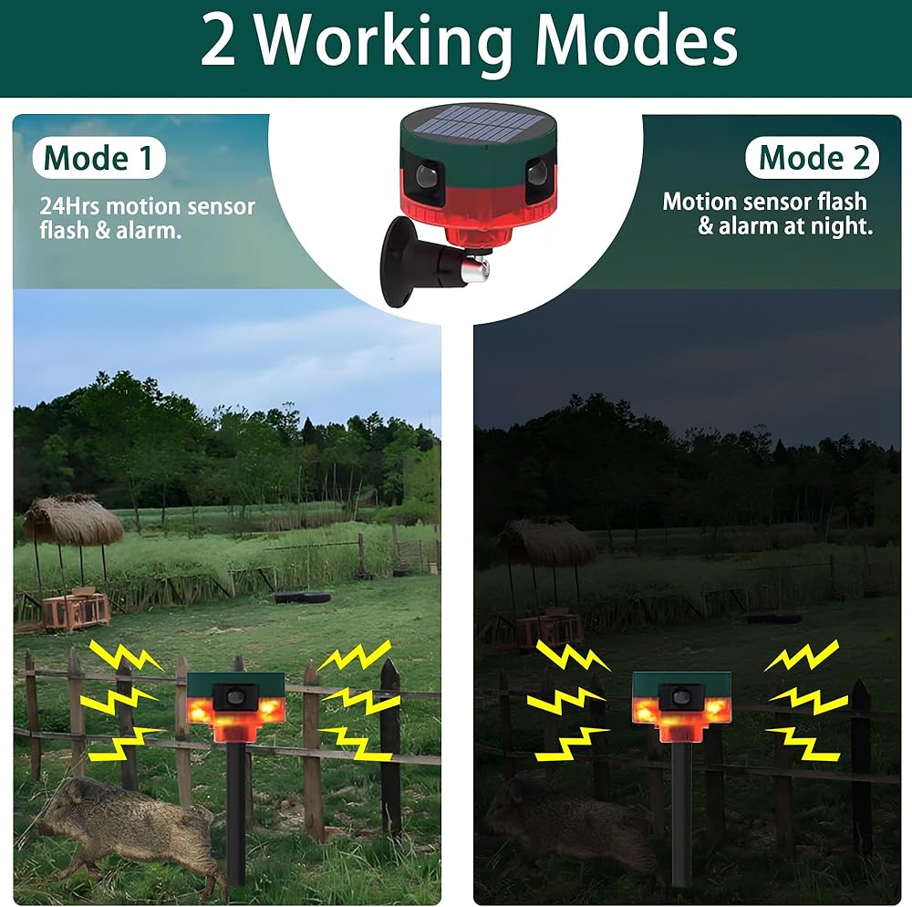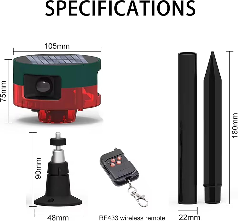 【Multiple Working Modes】①24hours Ultrasonic+Flashing;②Ultrasonic+Flashing at Night;③24hours Siren+Flashing;④Siren+Flashing at Night.