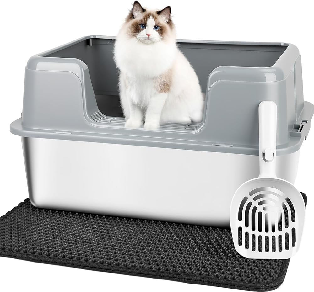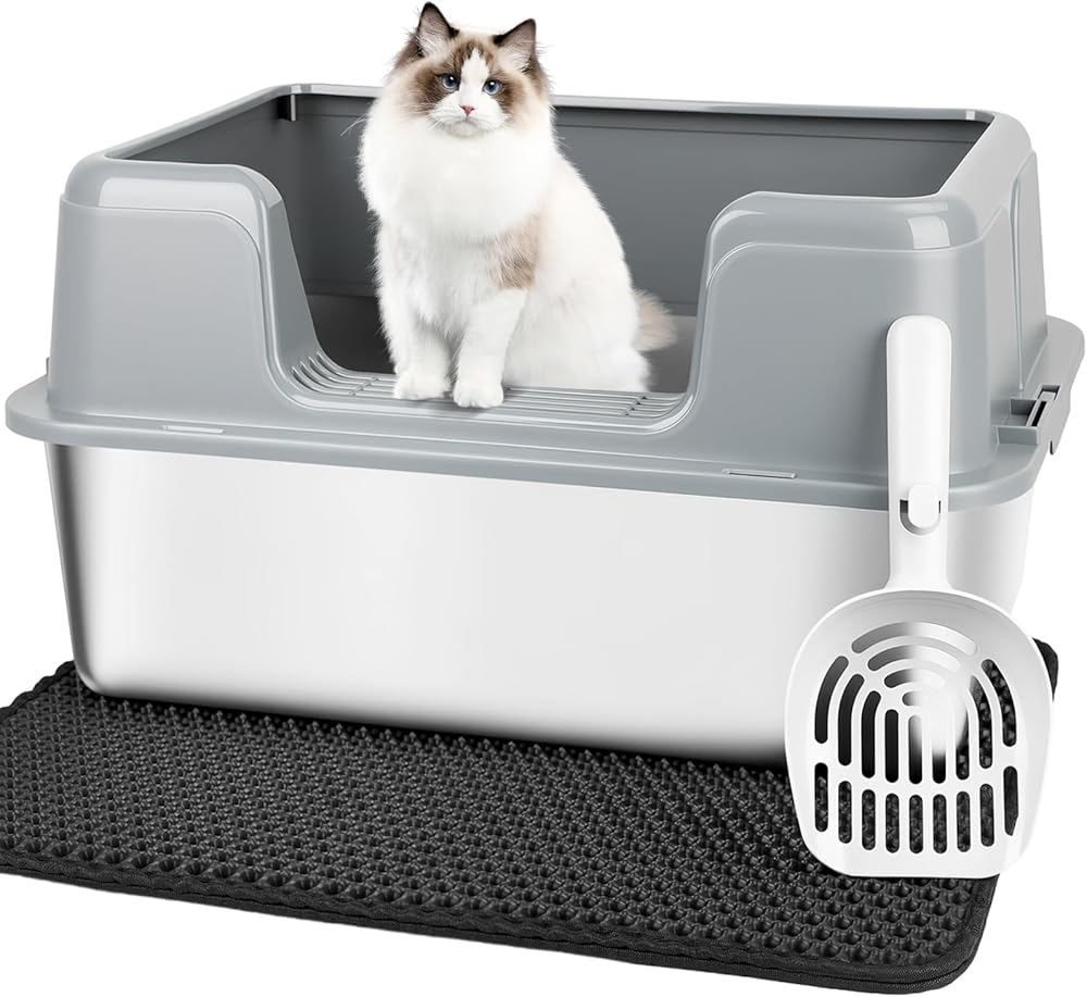 Package Includes: 1 stainless steel litter box, 1 litter mat, 1 litter scoop, 1 foot board