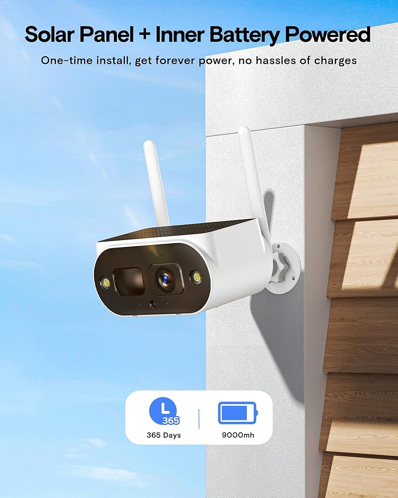 100% Wire-Free & Forever Power: Our solar security cameras wireless outdoor come with an Integrated 1.5 W solar panel, 3 hours of direct sunlight every day keeps the wireless outdoor camera running, and the built-in 9000 m.Ah rechargeable battery keeps the camera working when the sunset or on rainy/cloudy days, once install and works forever