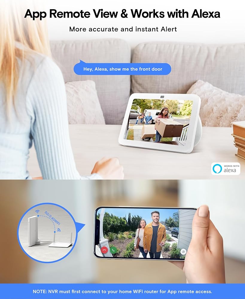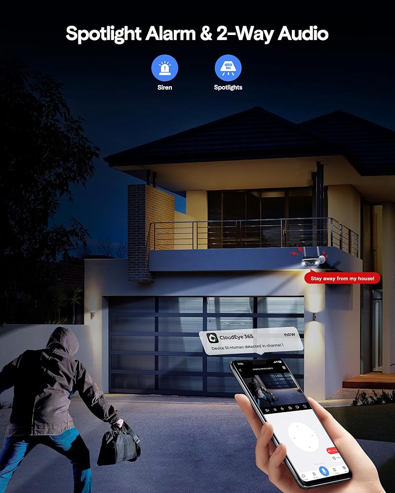 Spotlight Alarms & 2-Way Audio: The wireless solar surveillance cameras built-in microphones and speakers provide clear two-way audio calls in real-time. The highly intelligent sirens and spotlights can help you warn the suspicious around your house. Also, the NVR built-in speaker can sync the alarm to reminder anyone in home to take actions in time to protect your property