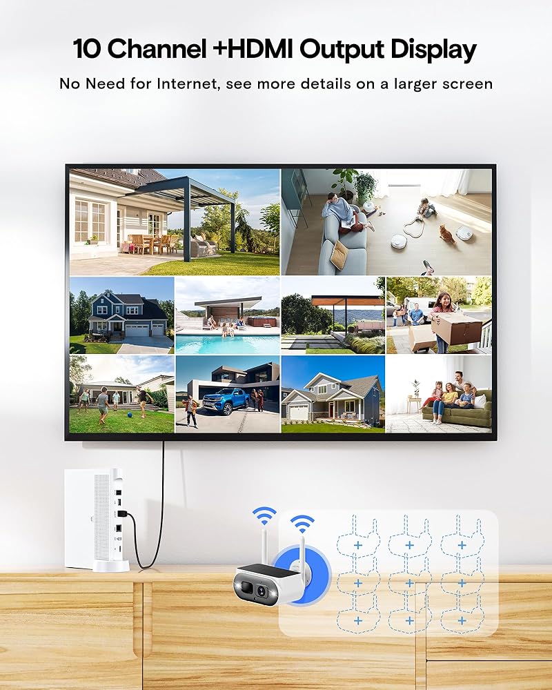 10-Channel Expandable & HDMI Output NVR: This Solar Security Cameras Wireless Outdoor System is equipped with a 10-Channel NVR, which allows you to add up to 10 cameras of the Camcamp brand to expand your monitoring needs. Also, there is an HDMI port on the NVR, so you can easily view or playback all the cameras on a bigger screen, monitor,smart TV, PC