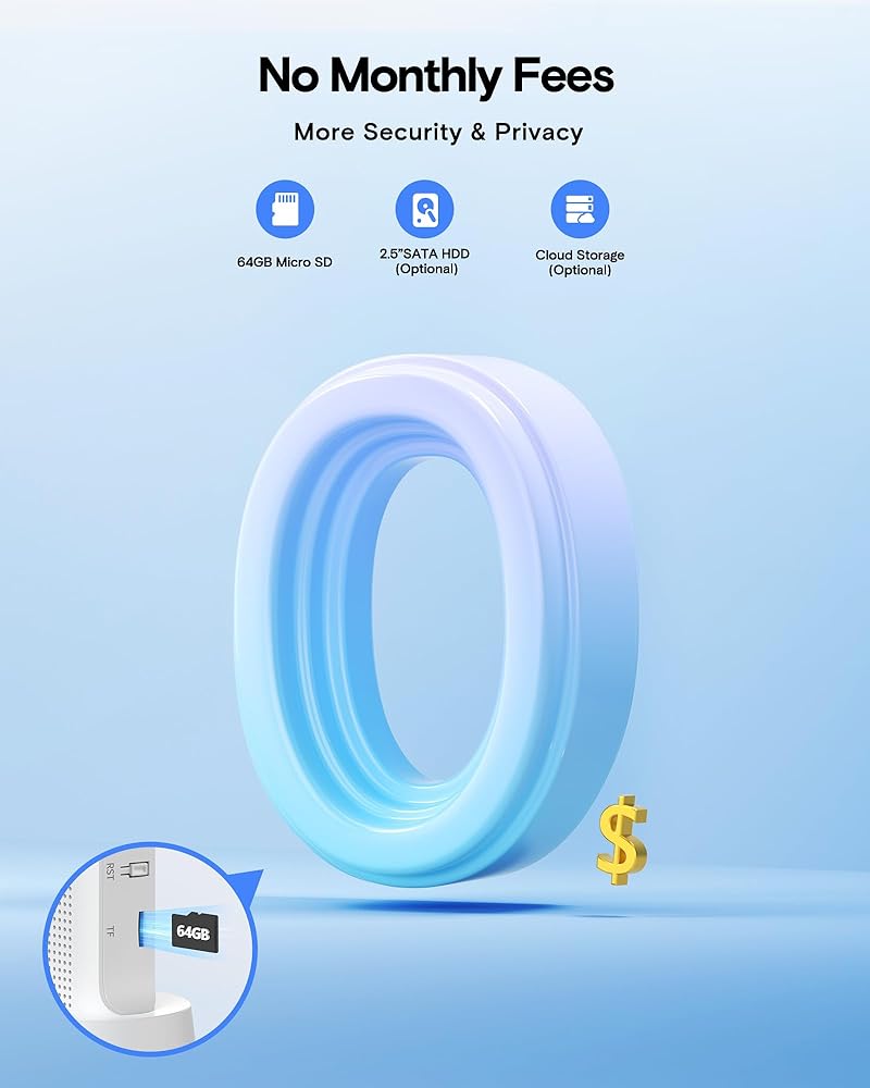 No Monthly Fee & 64 GB Local Storage: The solar home security camera system has built-in 64 GB Micro SD (Max.128 GB) in the NVR already, all your video data of 180 days (6 months) is securely encrypted and stored locally, with no subscription or hidden cost. Even if the cameras are damaged or lost, the data remains safe still (2.5" SATA HDD or Cloud Storage is Optional)