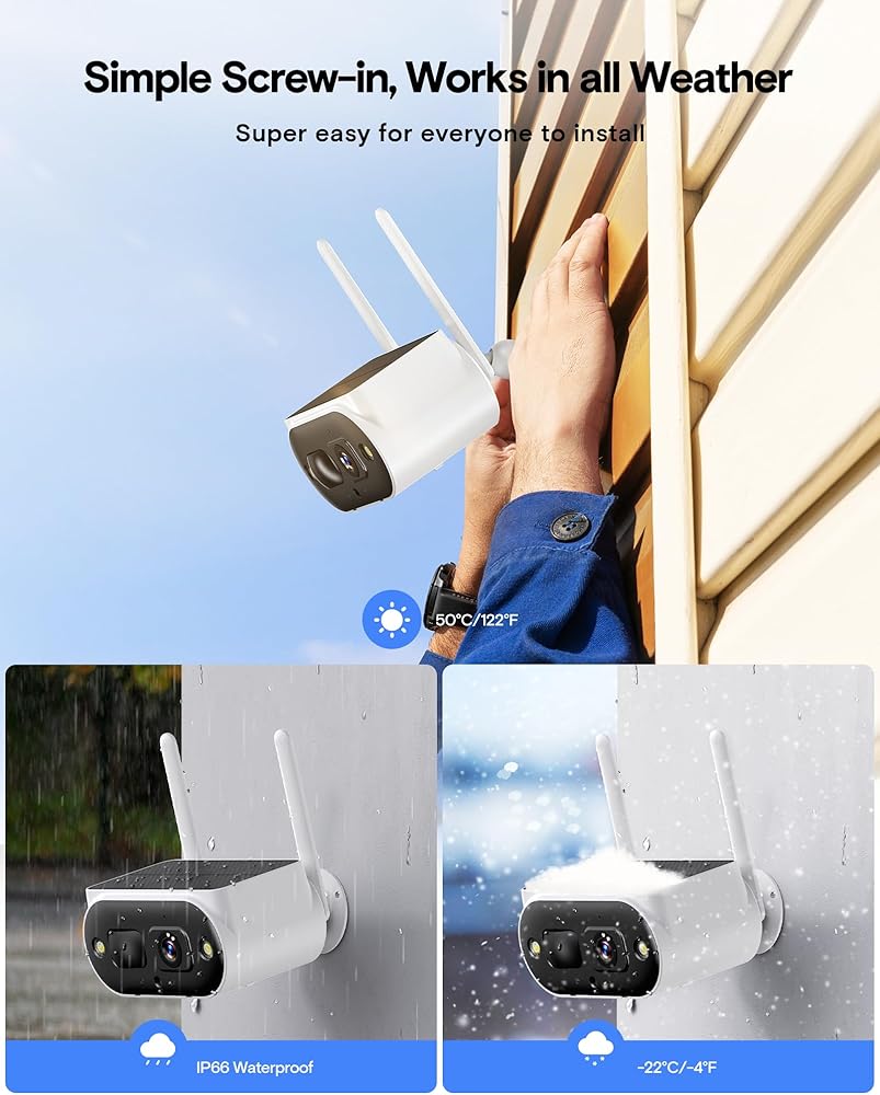 Fast and Easy Installation & IP66 Waterproof: Totally 100% Wireless cameras just need screw in and are flexible to adjust the angle, making the installation fast and easy for anyone. The IP66 weatherproof design made the solar security camera outdoor wireless work well in all kinds of conditions within temperatures -22°C ~ 50°C(-4°F~122°F)