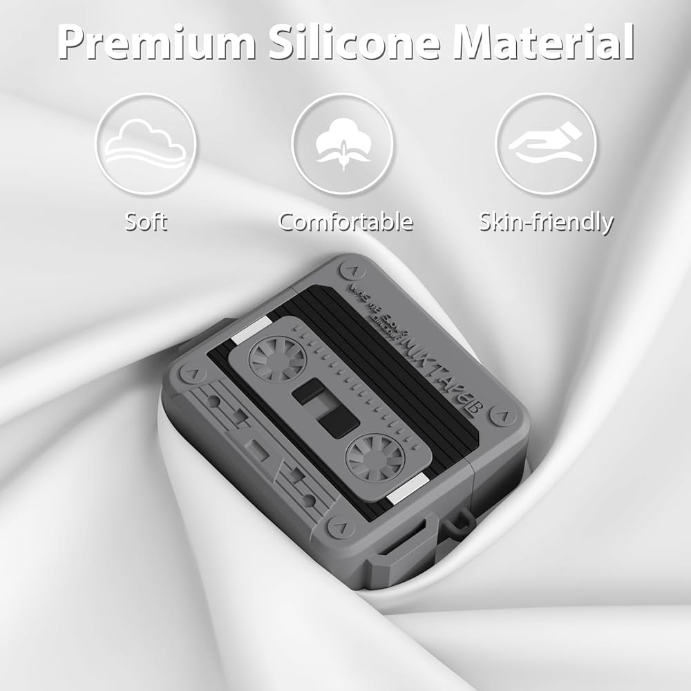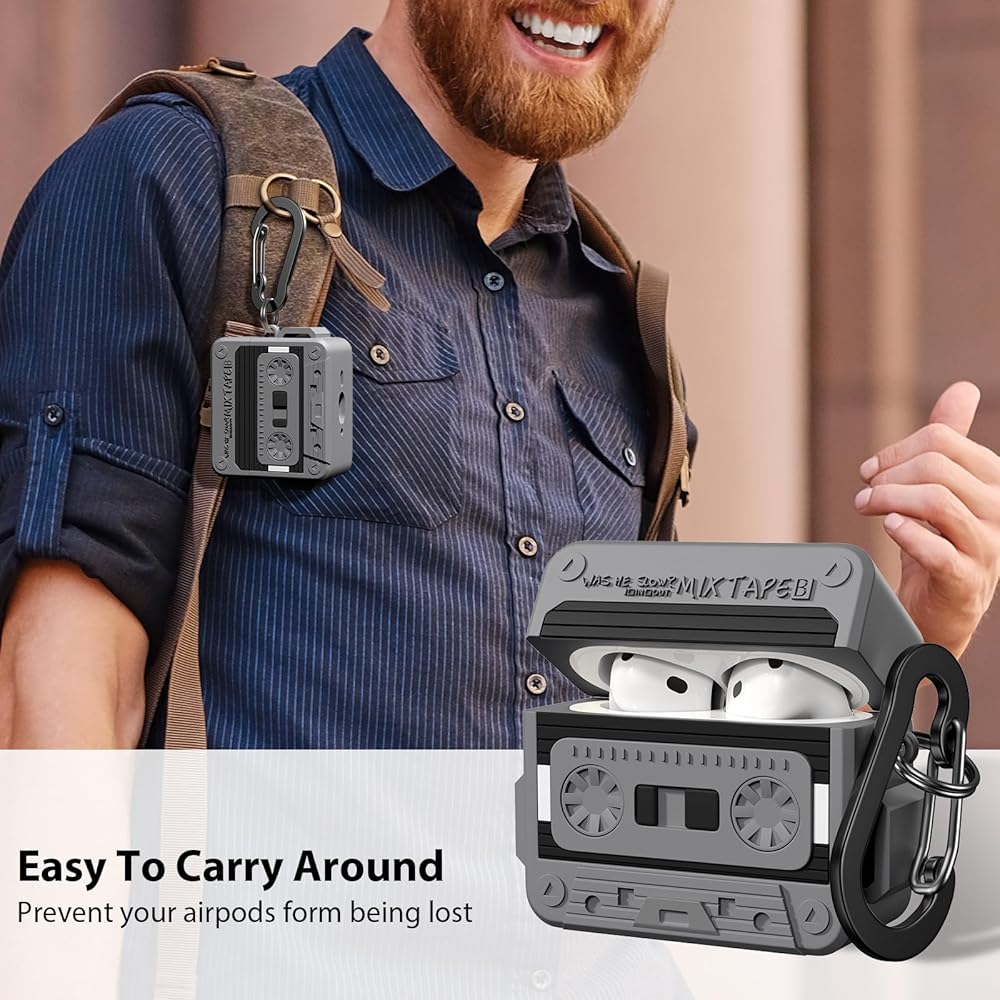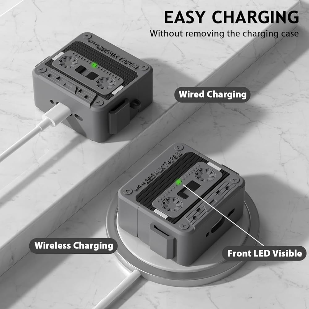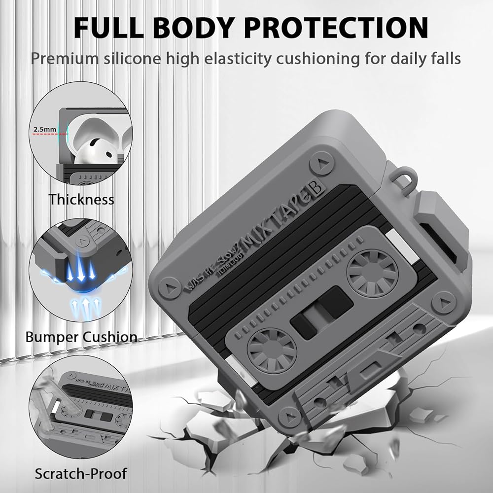 MOFREE Compatible with AirPods 4 Case Cover with Cleaner Kit/Keychain, Cassette Tape Design, Soft Silicone Shock-Proof Protective Case for AirPods 4, Gray Black
