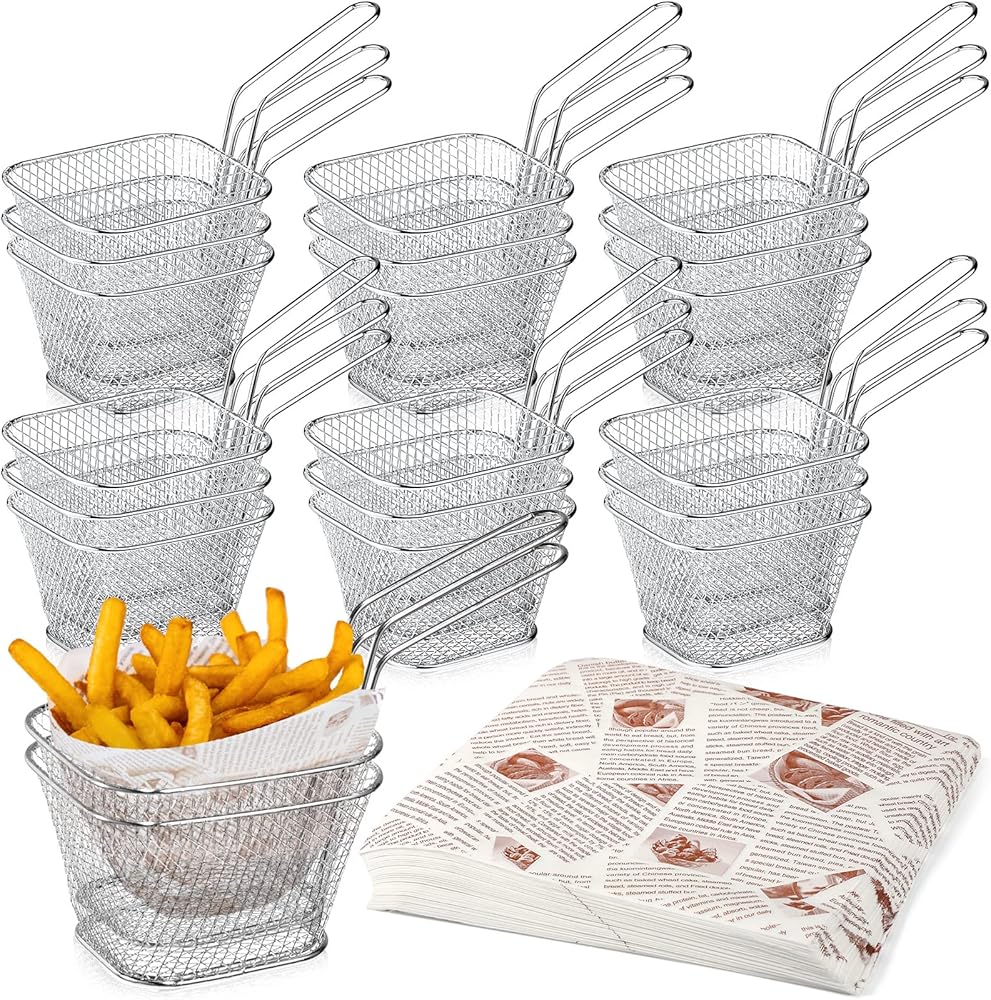 Quality and Reliable: the fry basket is made of chrome plated steel, not easy to rust or deform, reusable and safe to use, and the sandwich wrapping paper is made of paper, covered with a film, which is nice for oil or water proof and convenient to use