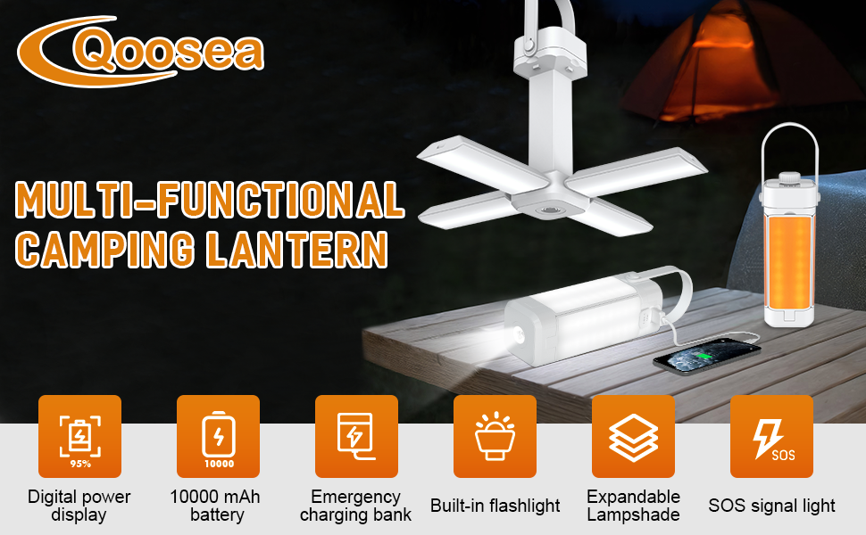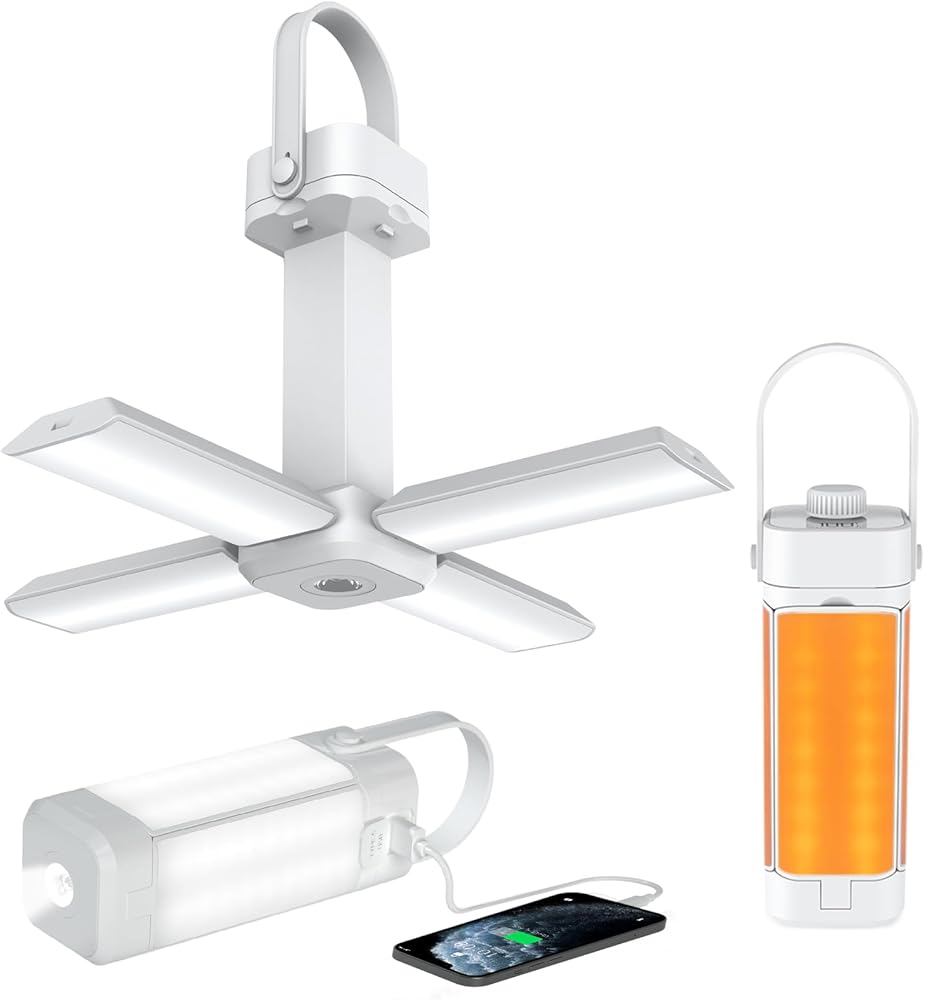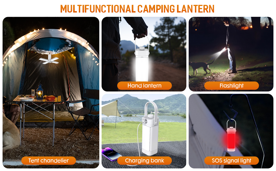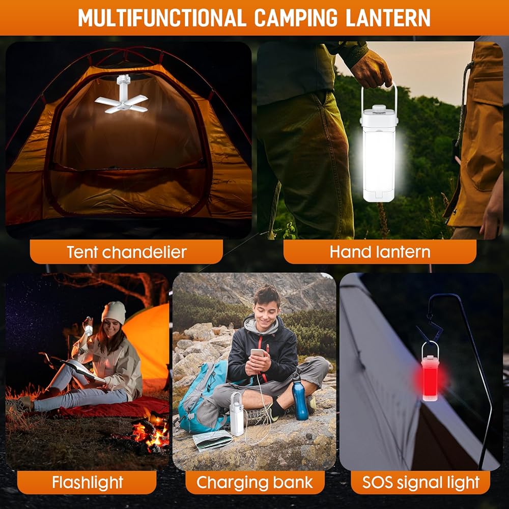 【5-in-1 Design】This camping lantern features a unique 5-in-1 design. It comes with 4 collapsible light bars that provide 360° all-around illumination as a tent chandelier; The light bars can be folded and converted into a portable light. The flashlight function makes it simple to find objects or illuminate small spaces at night. Comes with a rechargeable battery function that provides timely power support for your phone. The SOS mode adds an extra layer of security to your safety.