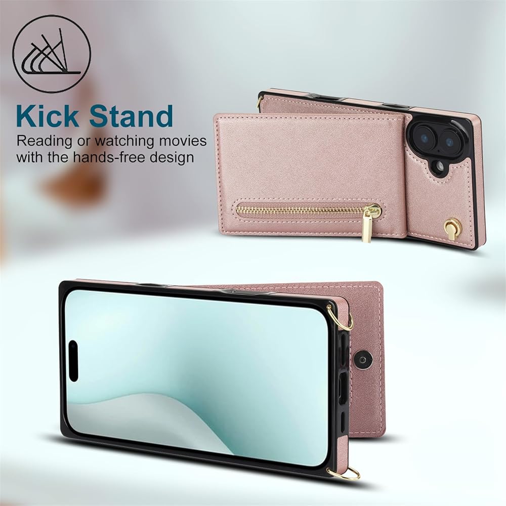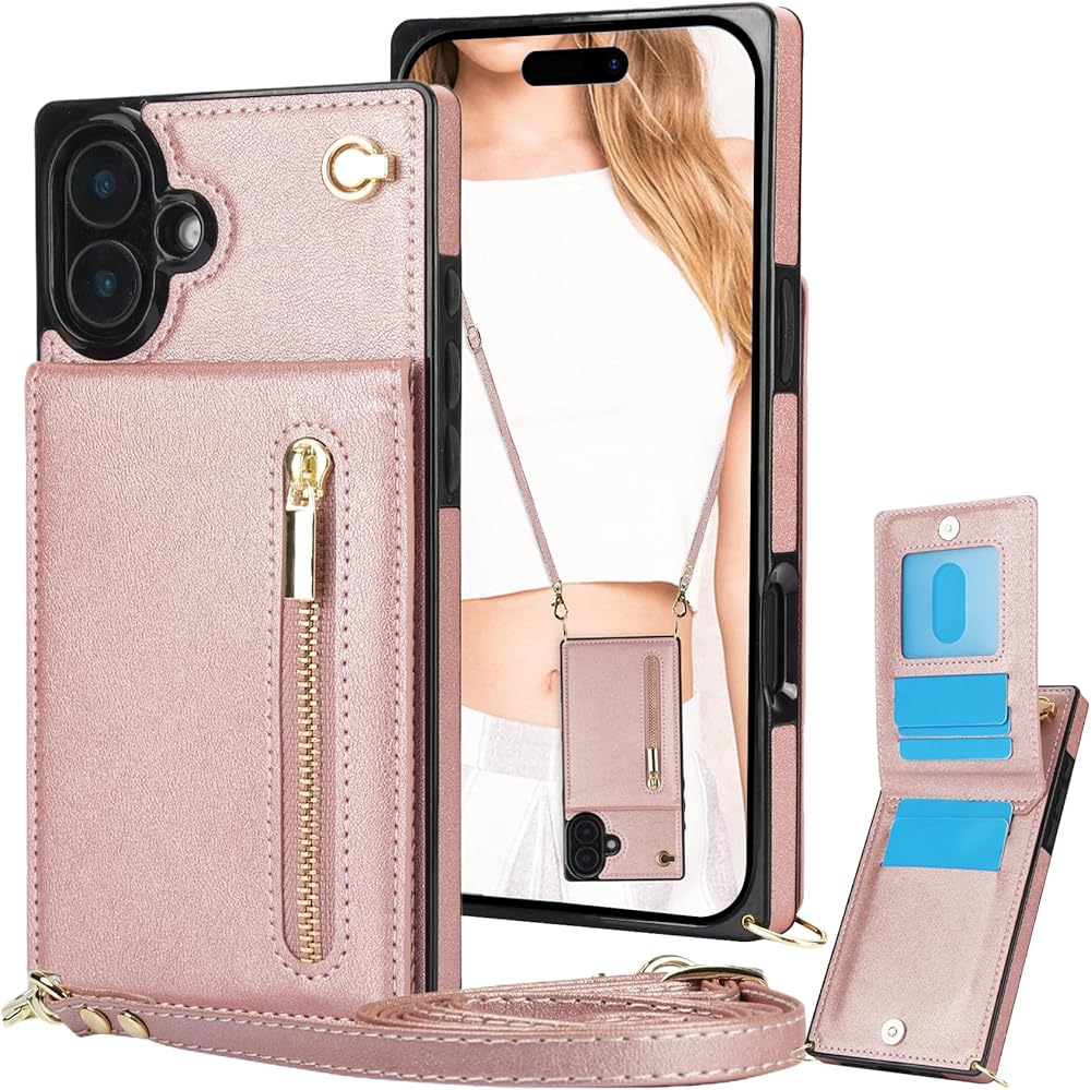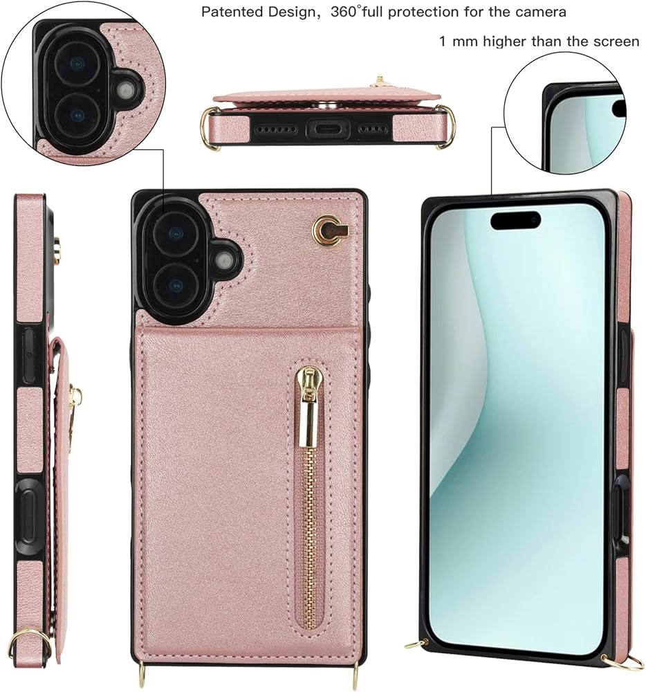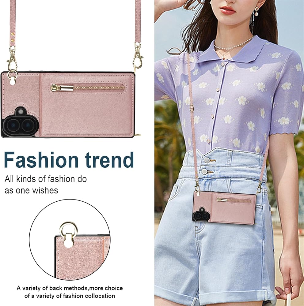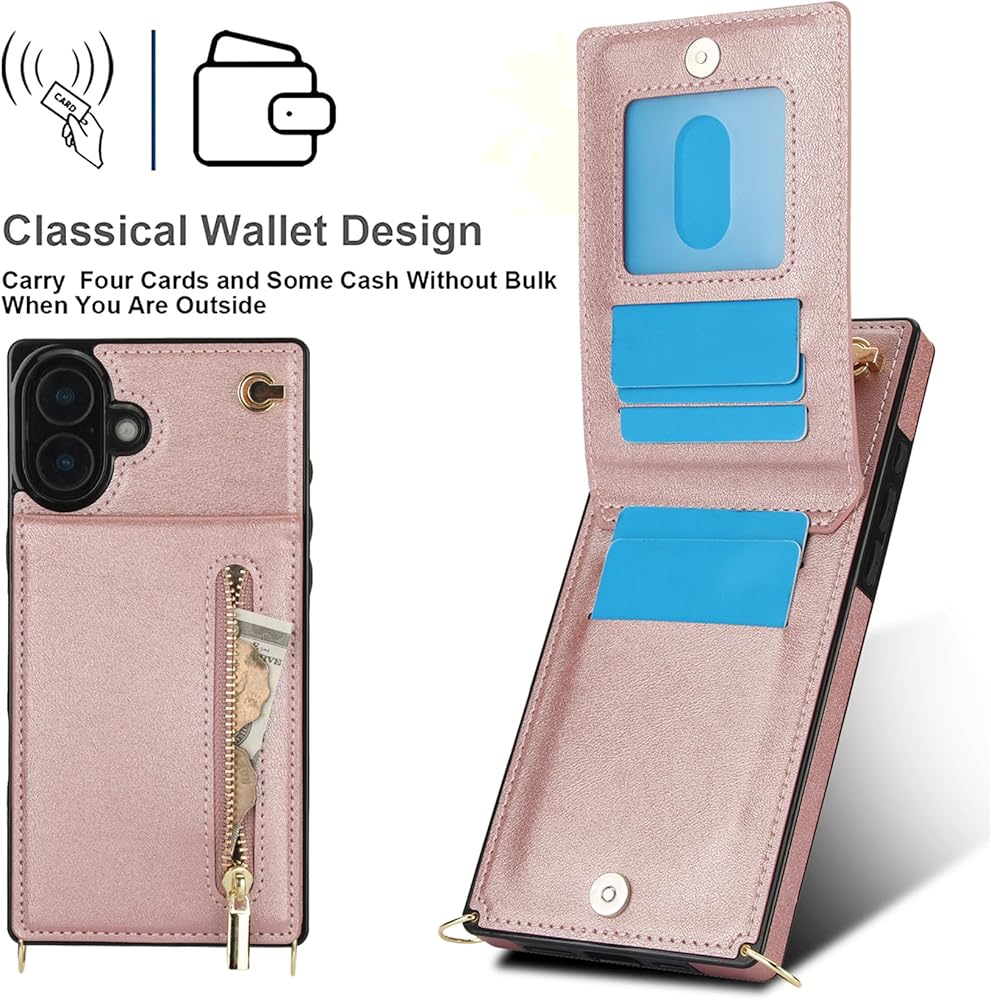 for Apple iPhone 16 Plus Case Wallet with Card Slots Holder for Women, Crossbody Zipper Lanyard PU Leather Protective Case Cover with Removable Shoulder Strap for iPhone 16 Plus ZP Rose Gold