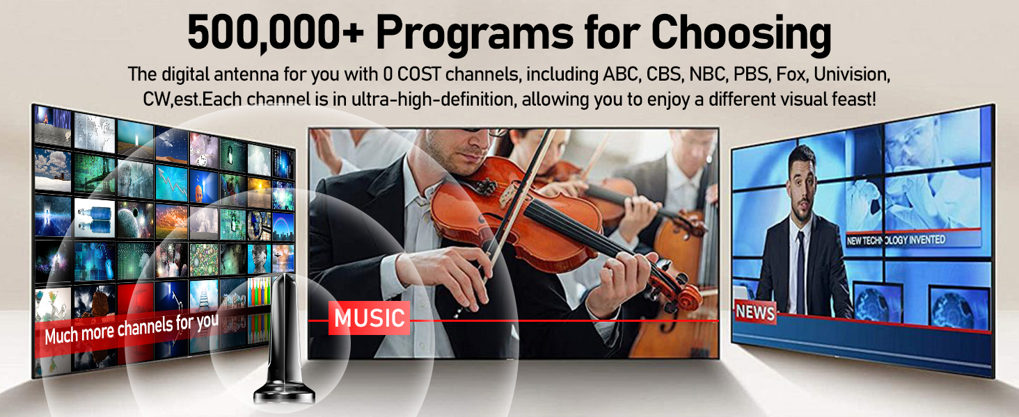 Much Local Channels & HDTV Clear Image: Say goodbye to high TV bills! Just enjoy the HDTV free channels with this TV antenna! Owning this digital antenna can save you MUCH MORE US dollars every year. All you have to do is enjoy hundreds of HDTV programming with no pixelation. The hdtv antenna starts to access the news, sitcoms, kids, and sports programs! The indoor antenna for smart tv for you with 0 COST channels, including ABC, CBS, NBC, PBS, Fox, Univision, CW,est.