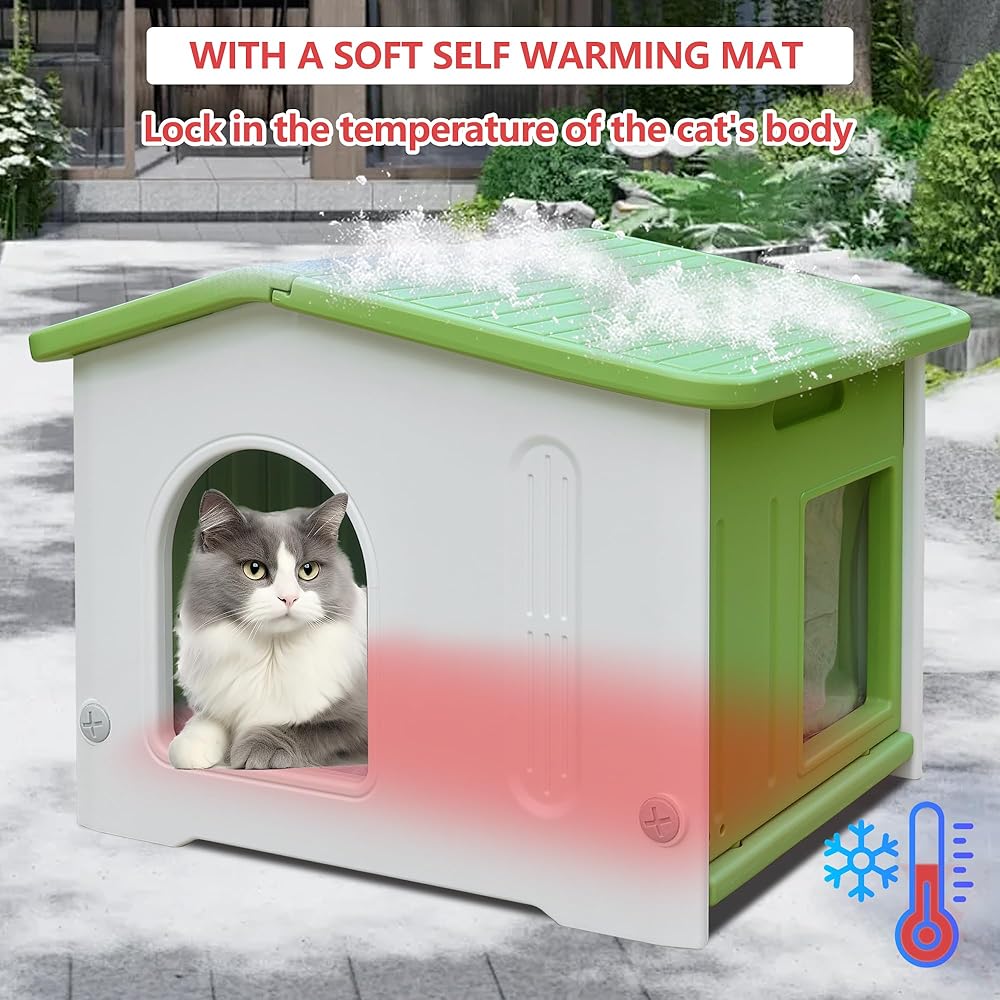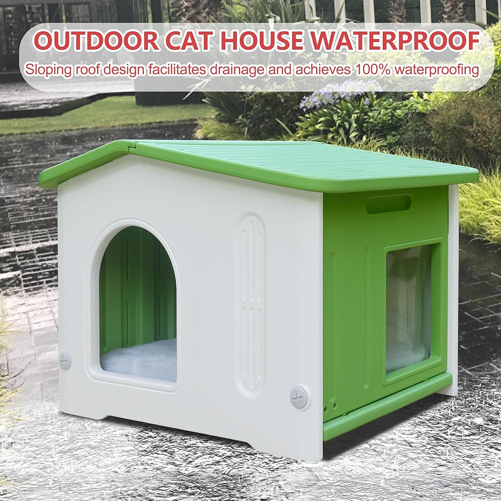 Outdoor Cat House with Escape Door,Feral Cat House with Selfwarming Mat Outdoor Cat House Watwerproof Large Cat House for 1-2 Cats, Assemble Easily-Green