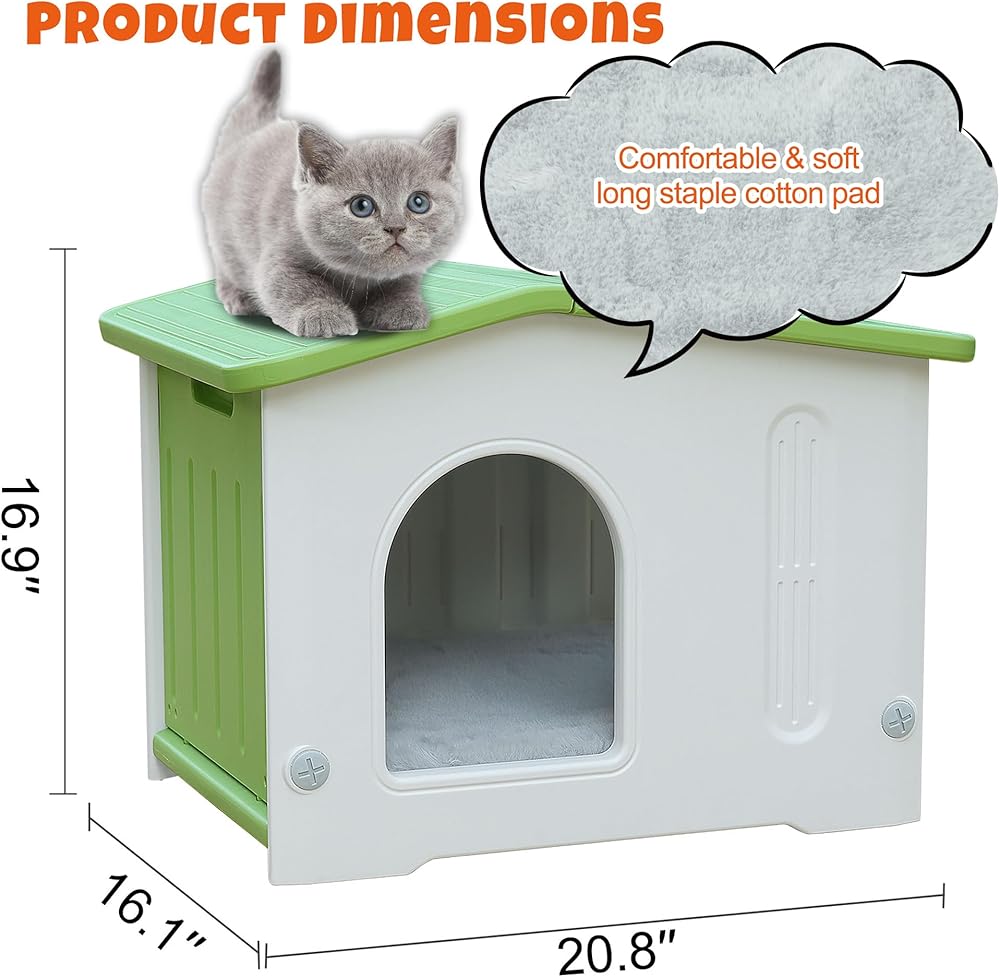 ♕Spacious Outdoor Cat House: The cat house measures 16.1"D x 20.8"W x 16.9"H, spacious living space is suitable for kittens, puppies and other small animals, and our cat house is equipped with a cat bed cushion that fits seamlessly inside