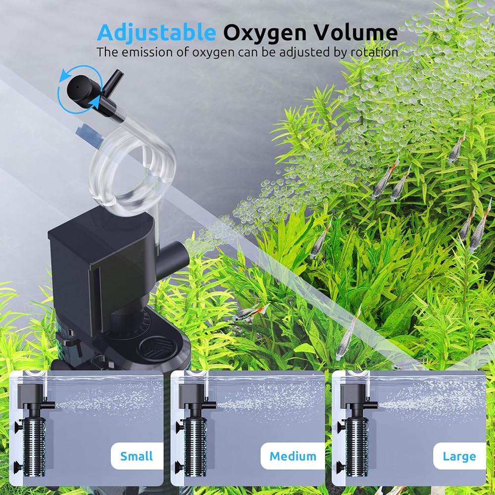 {Silent operation} Say goodbye to noisy filtering systems. Our aquarium filters operate silently, ensuring a peaceful and stress free environment for you and your aquatic companion(There may be a slight oxygen spray sound when using the oxygen spray function)