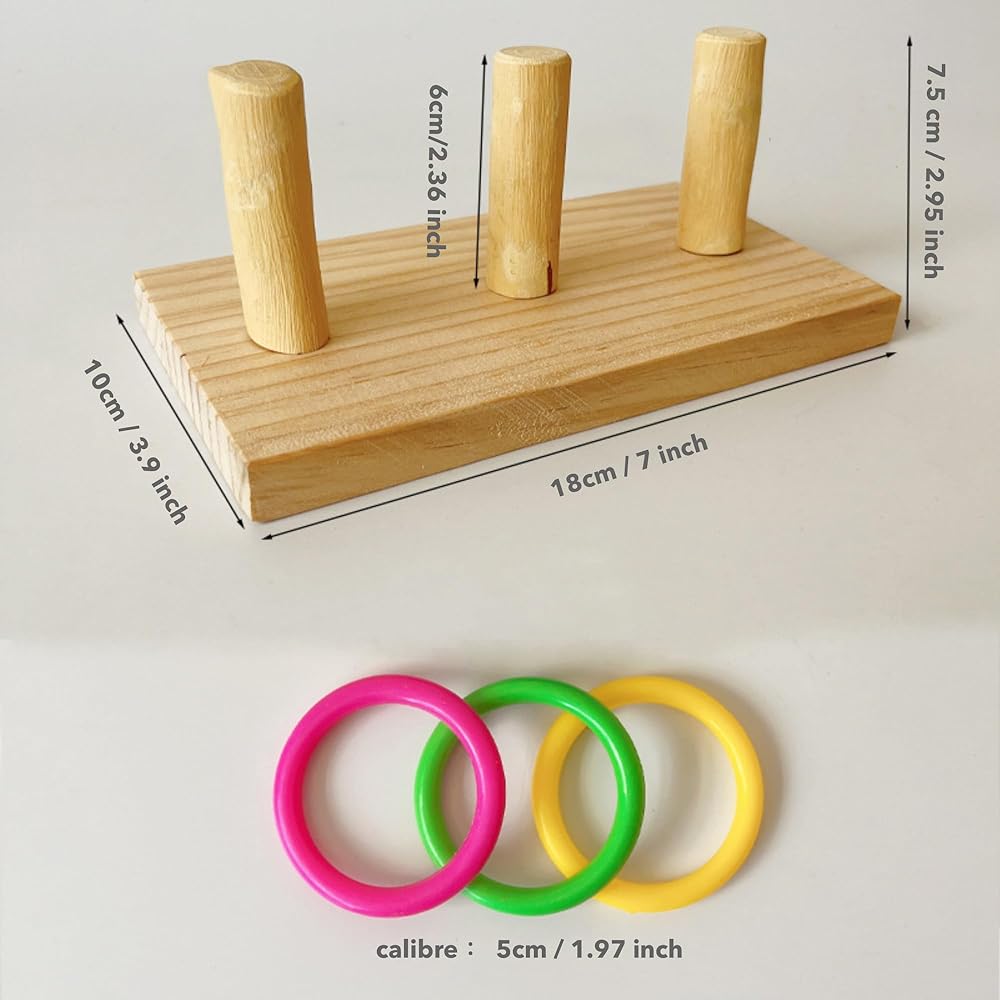 Package Contents: 1 Piece 3 columns bird ring toy and and 1 pcs natural nuts bird bite block tearing toy, ring toy including 9 rings, the diameter of the ring is 1.97 inch. Parrot intelligence toy the ferrule is brightly colored to keep the parrot in a happy mood, the cylinder height is just right for play and viewing.