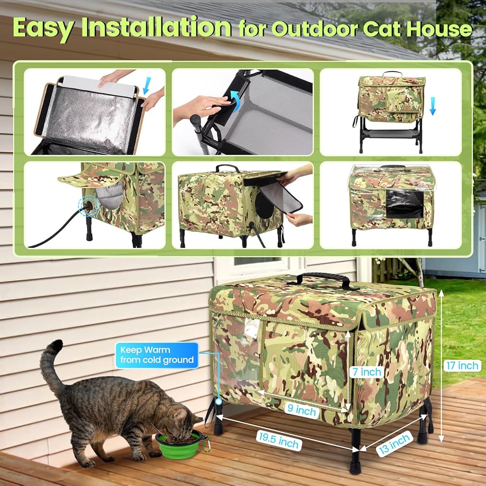 【𝐄𝐚𝐬𝐲 𝐭𝐨 𝐂𝐥𝐞𝐚𝐧】You are providing a heated cat house with two large side door to clean the inner house easily. The liner is easy to attach and also can be remove to water-based rinsing washable.In addition, our matching collapsible cat bowls offer kids and caring people to throw in their food and hang around the floor pegs with ease.