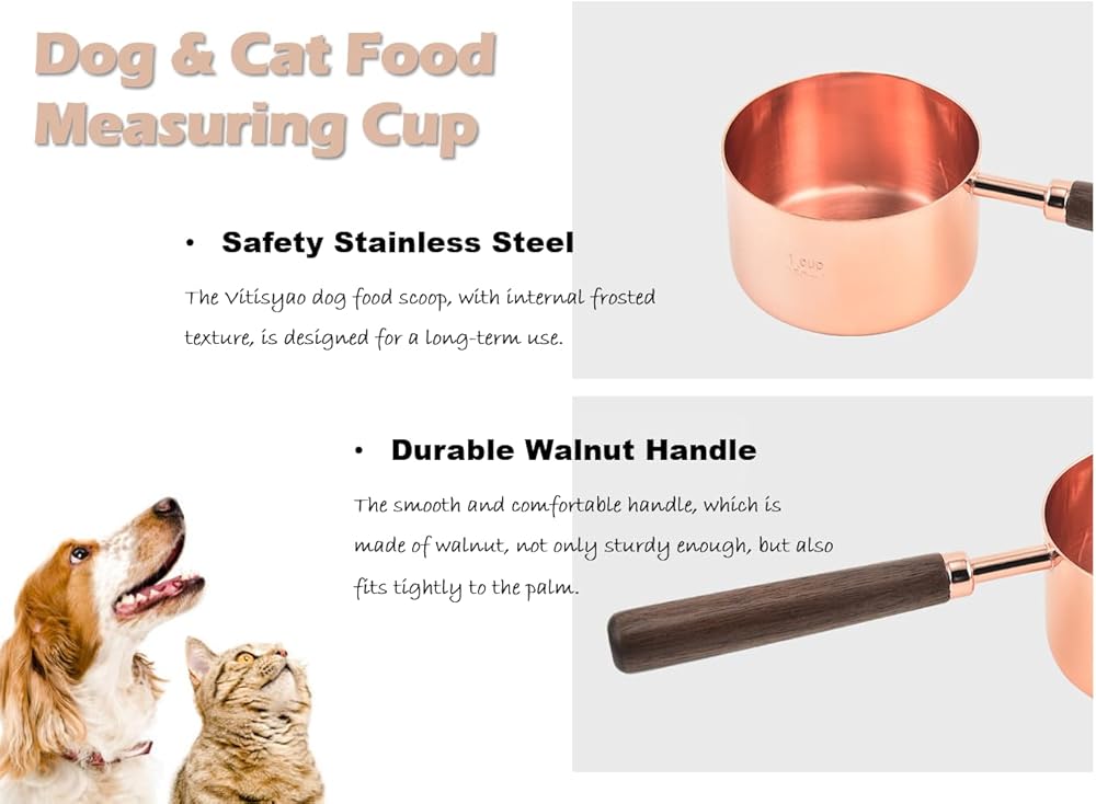 High-grade Stainless Steel - Different from fragile plastic scoops, the Vitisyao dog food scoop, with internal frosted texture, is designed for a long-term use.