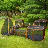【7-in-1 Outdoor Cat Fence】The set includes: 2×hexagonal cat tent, 1×square cat tent, 1×conical cat tent, 3×pet tunnel, 1×portable carrying bag, 12×fixed stakes. The dimensions of each part of the indoor cat tunnel are as follows, square tent size: 27.55x27.55x27.55 inches, hexagonal tent size: 47.24x22.83 x 27.55 inches, conical tent size: 27.55x27.55x49.21 inches, tunnel size: 47.24x16.52 inches.