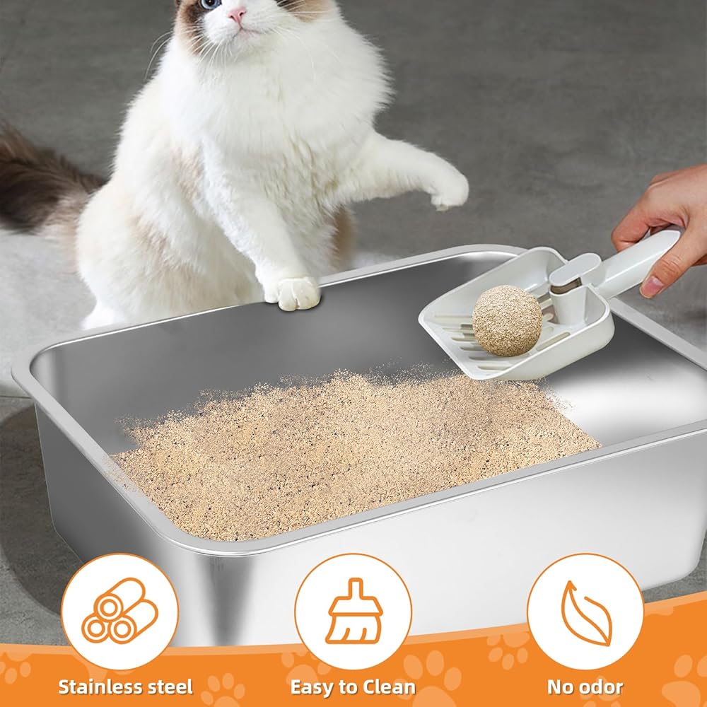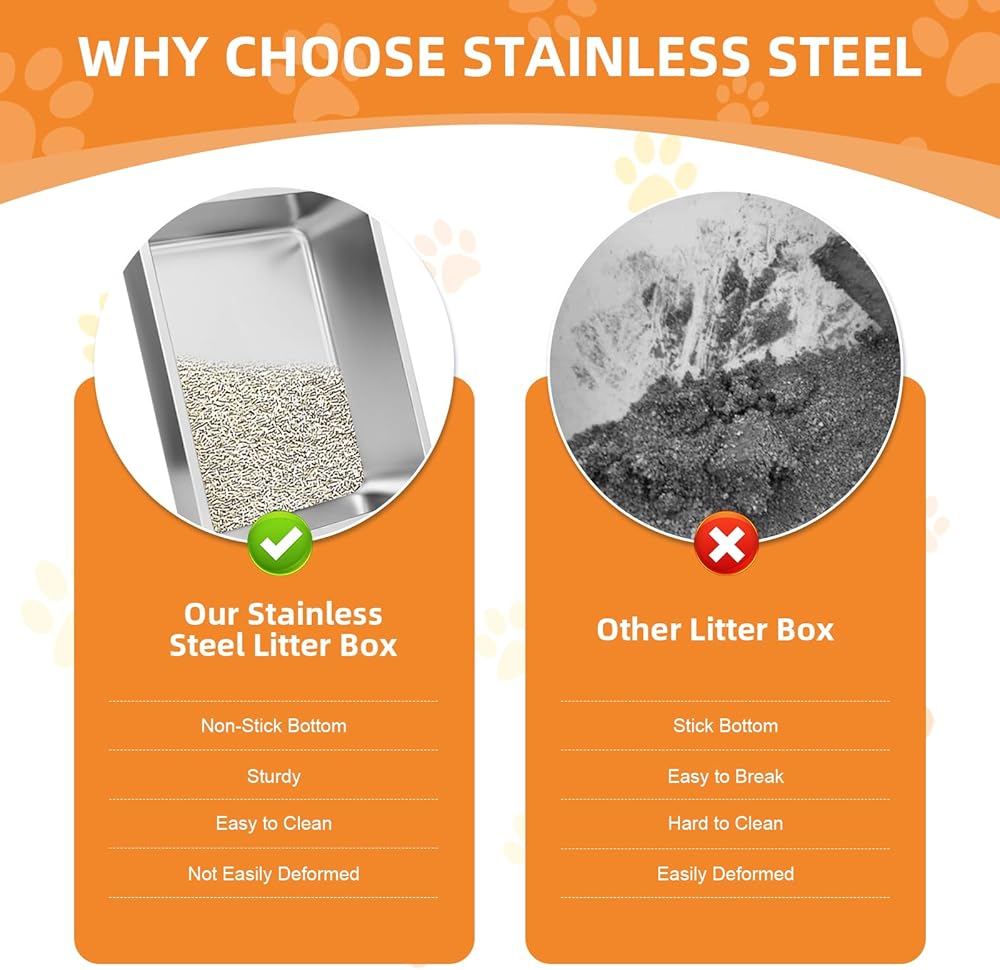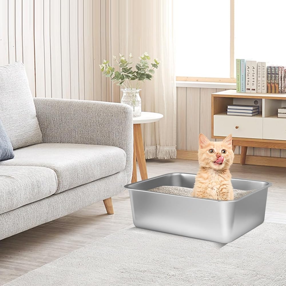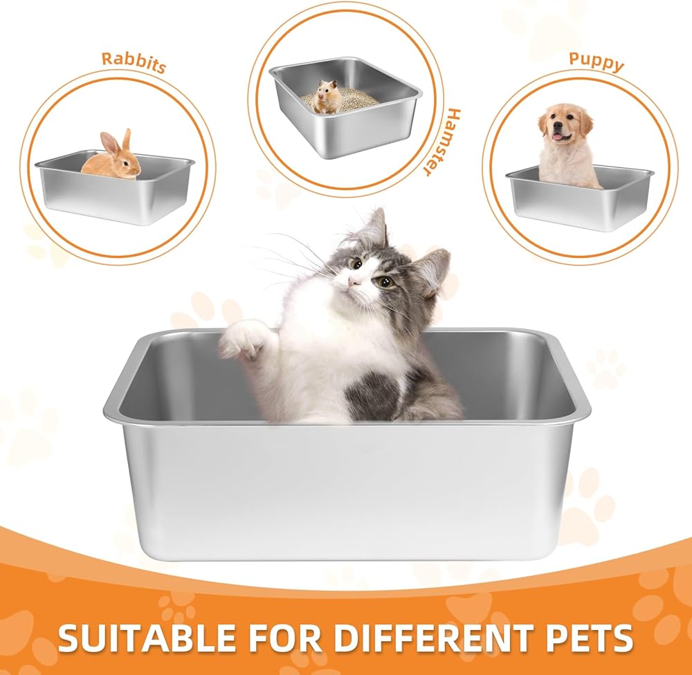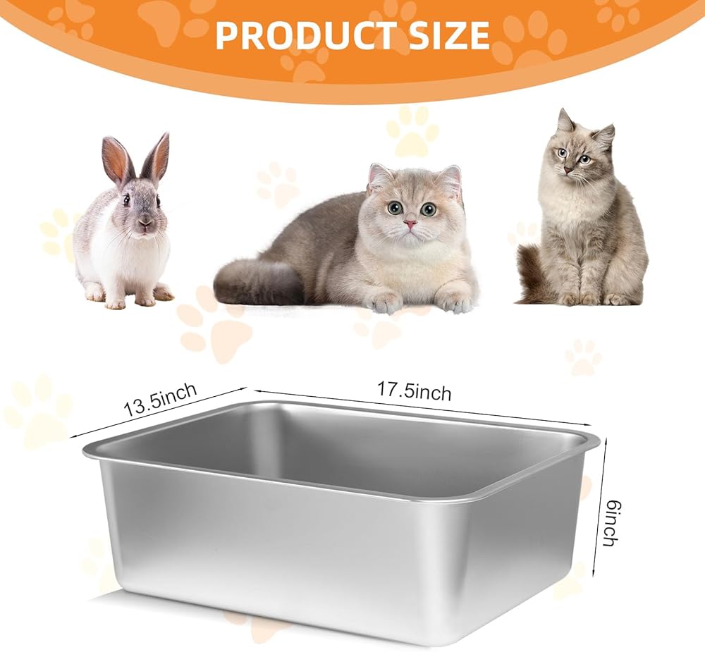 Spacious & High-Sided Design:The Stainless Steel Litter Box size is 17.5"L x 13.5"W x 6"H,The large dimensions and high walls provide ample space for your cat,ensuring no mess around the box.