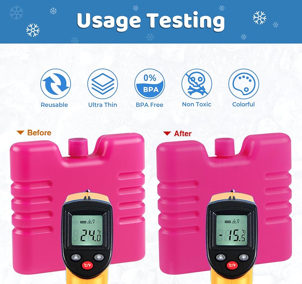 SAFE & BPA FREE:The ice packs for lunch boxes are made of environmentally friendly, non-toxic gel material, making it a healthier, pollution-free,long lasting reusable and leakproof.So the food items do not get ruined when ice packs start melt.