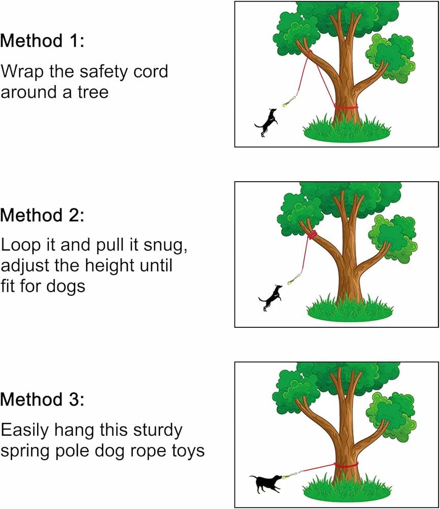 Versatile Hanging Options: We offer three versatile hanging methods for this spring pole for dogs toy. You can hang it on a branch, wrap it around a tree trunk and hang it on a limb, or wrap it around a tree trunk and tug horizontally. Each method provides a unique workout for different muscle groups, ensuring a well-rounded exercise session for your dog.
