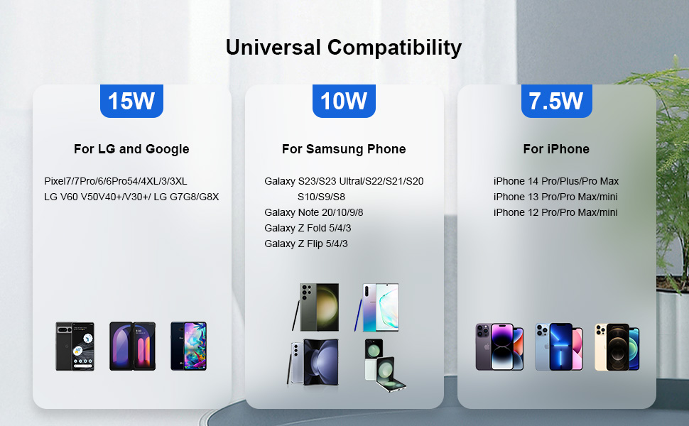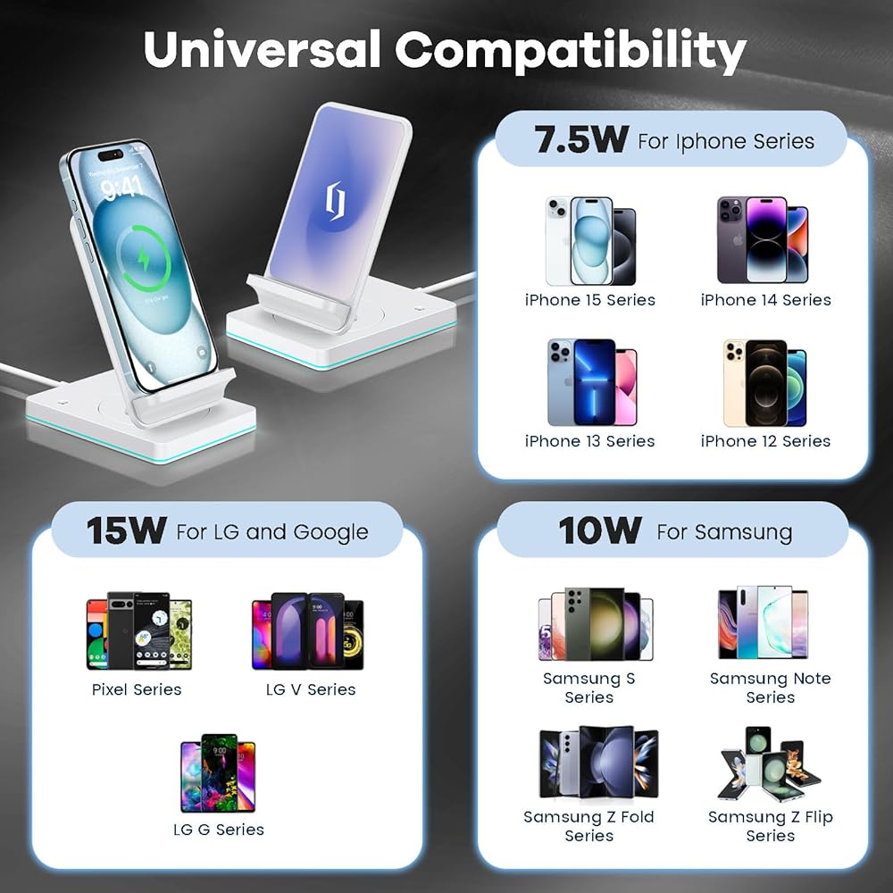 【Wide Compatibility】This 15W fast wireless charging stand compatible with Samsung Galaxy z flip 6/5/4,fold 6/5/4 Series, for Galaxy S23/S22/S21/S20 plus/Ultra,Note20/10/10+, for iPhone 15/14/13/12/Pro/Plus/Pro Max.