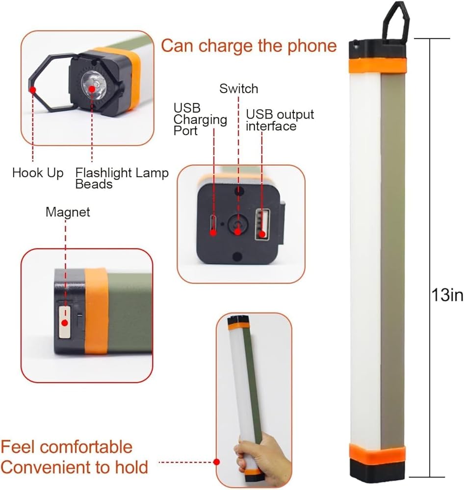 【3 Color temperatures + 13in Length + Hook】 The Portable Hanging Tent Night Light has 3 color temperatures:white light-warm light-neutral light. The length of the lamp body is 13in, the lamp bodycomfortable and convenient to handle. There is a hook at the tail of the lamp body, which can be hung to use. Can be used for camping lights, garden lights