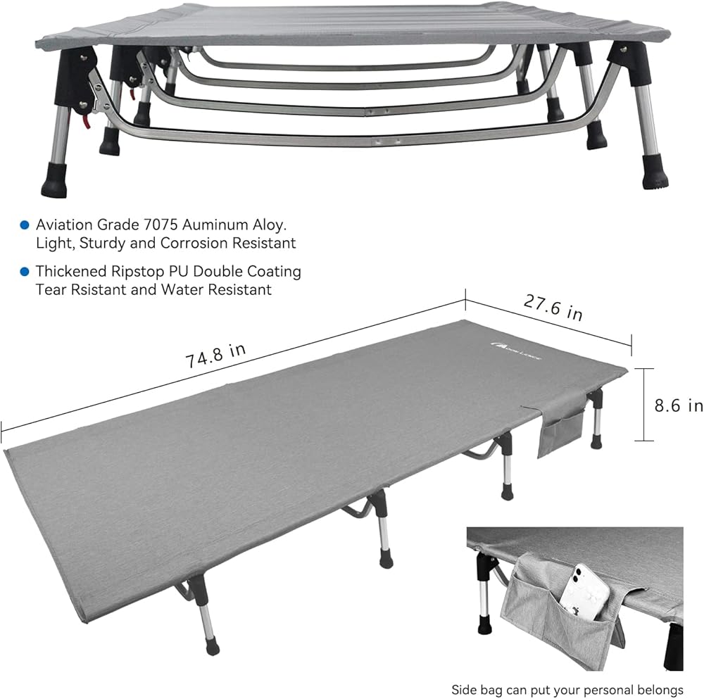 High Quality and Durable Material: Aircrafted-grade 7075 aluminum alloy made cot legs and ripstop 300D elastic polyester made cot sheet. PU double coating. The cot is in a very high quality and sturdy enough to support up to 400lb. Enjoy a nice sleeping in this reliable camping cot.
