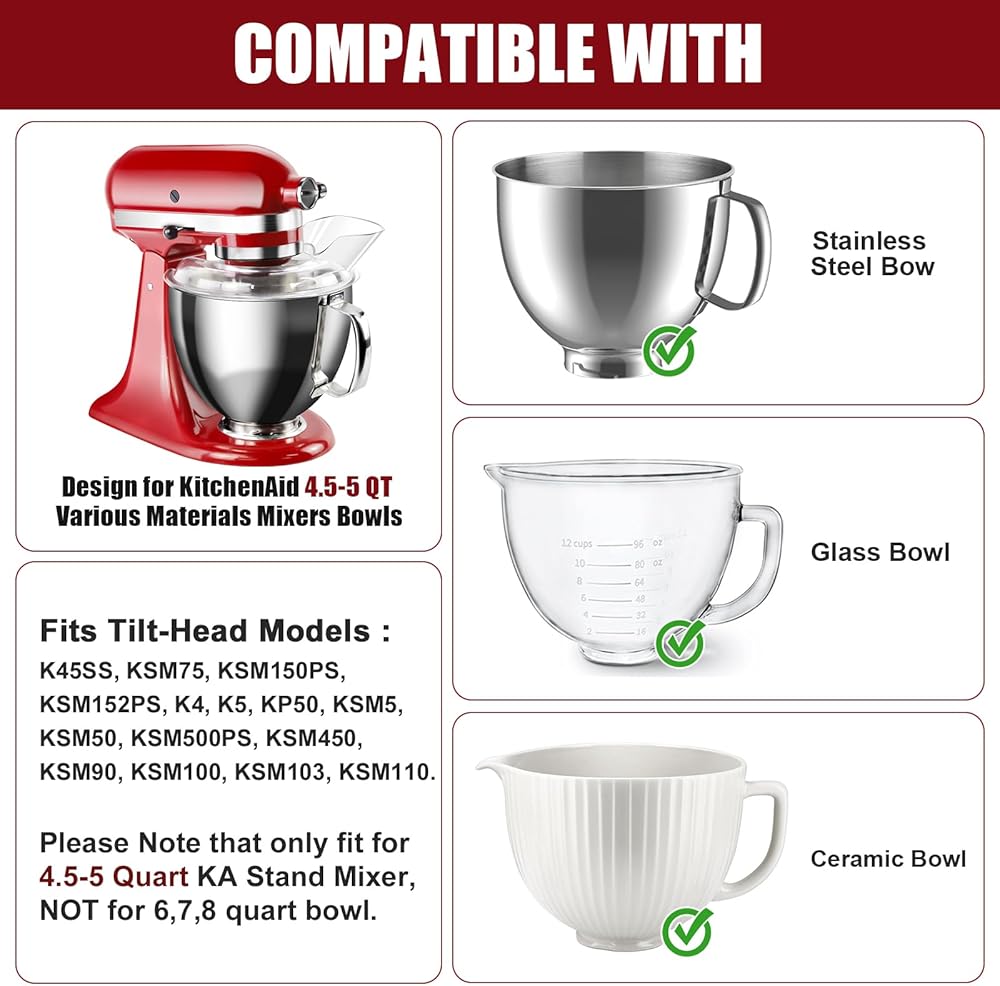 【Compatibility】This pouring shield is not only for Kitchenaid Stainless Steel Bowl, but also for Glass Bowl and Ceramic Bowl. The pouring shield fits for KitchenAid 4.5QT-5QT stand mixer, fits for K45SS, KSM75, KSM150PS, KSM152PS, K4, K5, KP50, KSM5, KSM50, KSM500PS, KSM450, KSM90, KSM100, KSM103, KSM110. Please Note that only fit for 4.5-5 Quart KA Stand Mixer, not for 6,7,8 quart bowl.