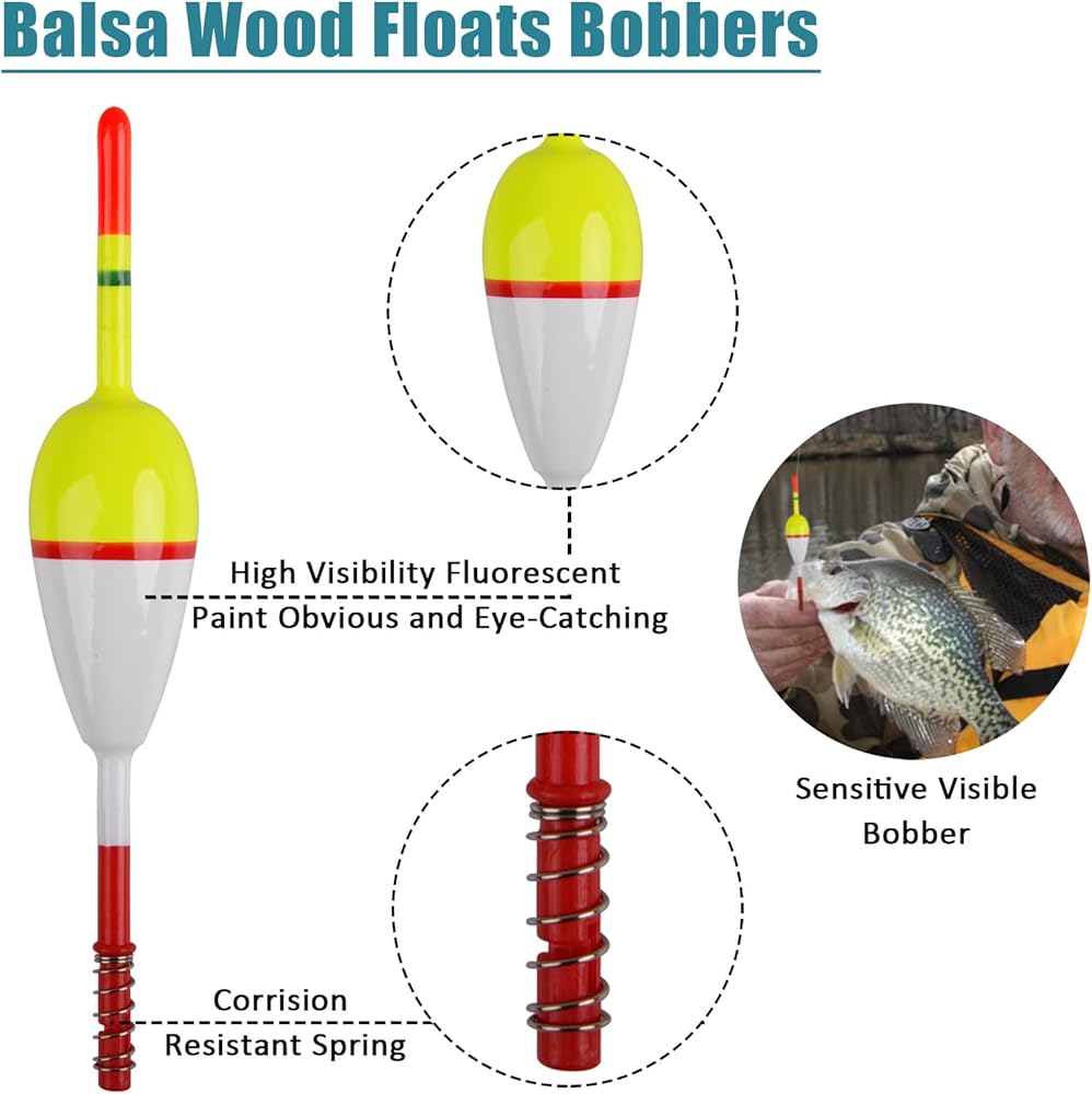RELIABLE MATERIAL: The fishing bobbers are made of quality lightweight balsa wood, features a crack- and chip-resistant finish, and the spring features good corrosion protection performance, lasting and practical for using a long time.