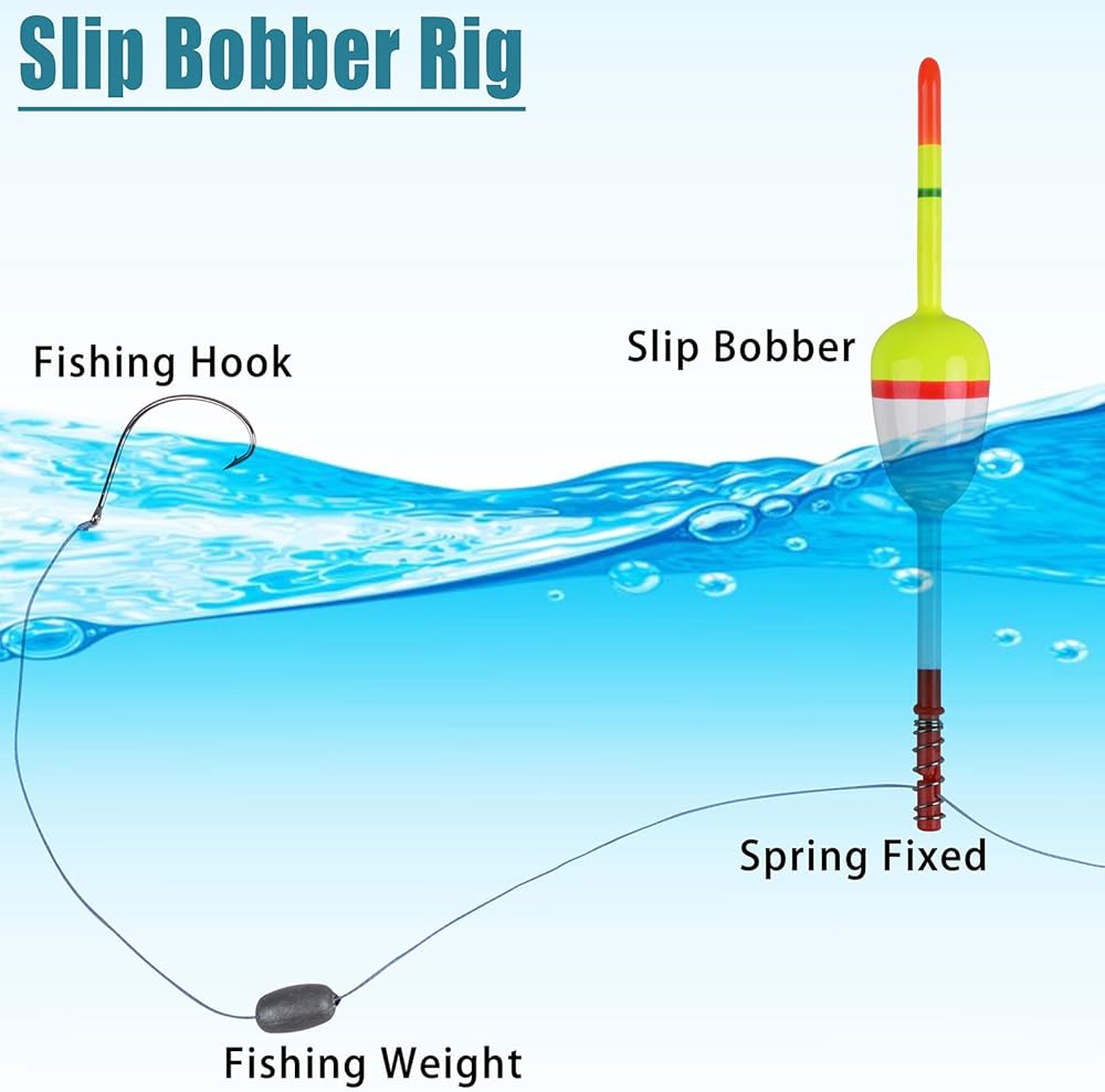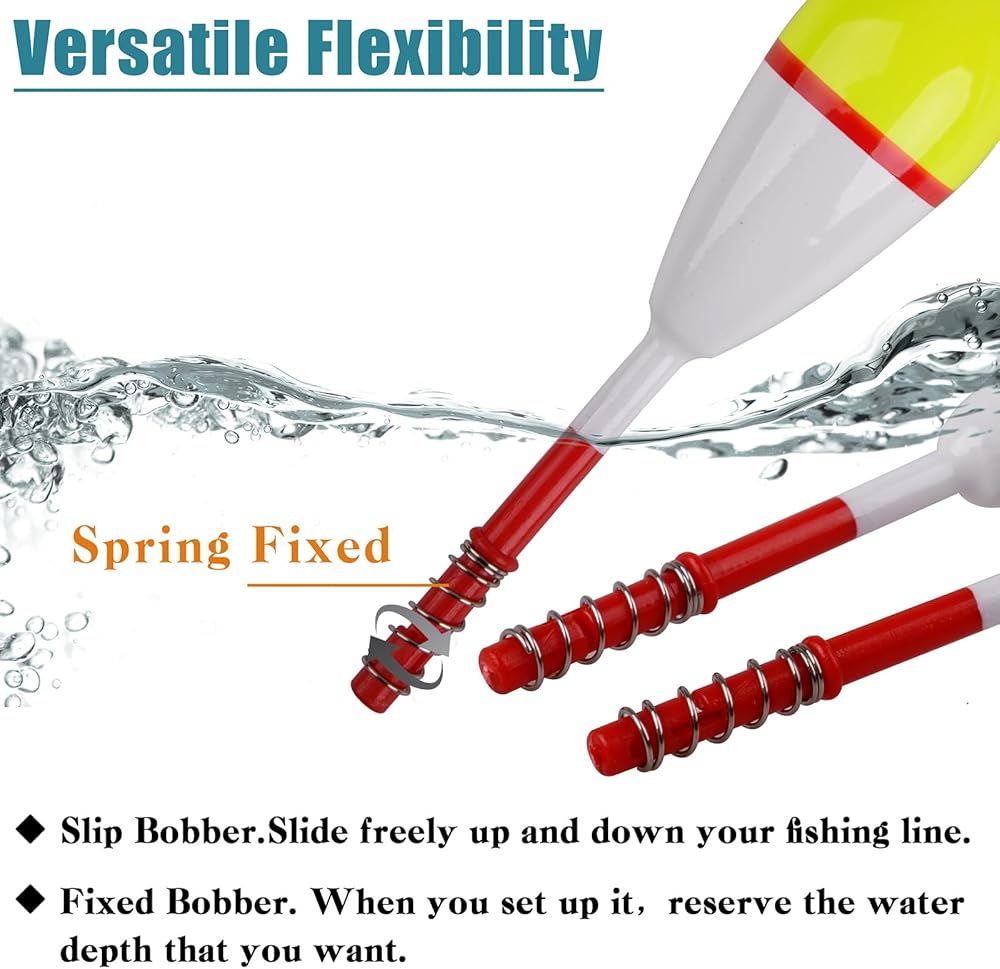 ADJUSTABLE FISHING BOBBERS: The float position can be adjusted by rotating the spring: slide bobbers or fixed bobbers. You can adjust it to present your bait to any depth and keep your bait in the strike zone longer.