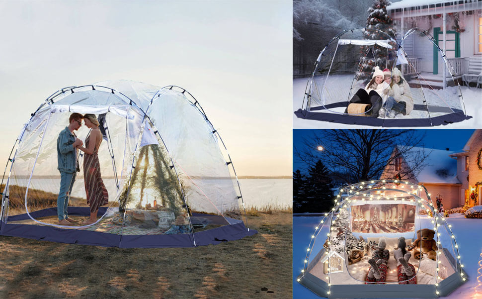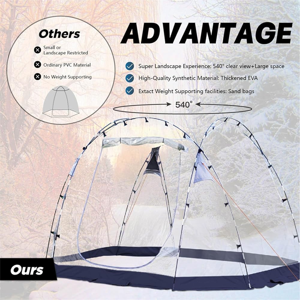 【PREMIUM MATERIAL】Bubble tents are made of super transparent EVA, which is non-toxic and waterproof. The thick clear material can keep you warm in cold days and allow a 540° clear view. (Please note that due to the particularity of the material, if you do not use the bubble tent, please fold it indoors or in a cool place to keep direct sunlight away.)