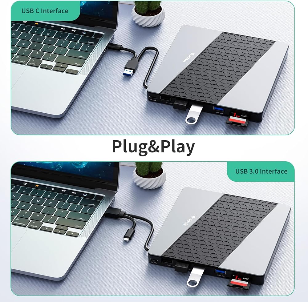 External CD DVD Drive for Laptop:This portable cd drive not only reads CDs and DVDs, but can also be used as a USB hub. Including 1*USB 2.0 Port, 1* USB 3.0 Port, 1*Type C Port, 1*SD Card Slot.The USB Hub makes it easy to connect the mouse, and keyboard and other USB devices.