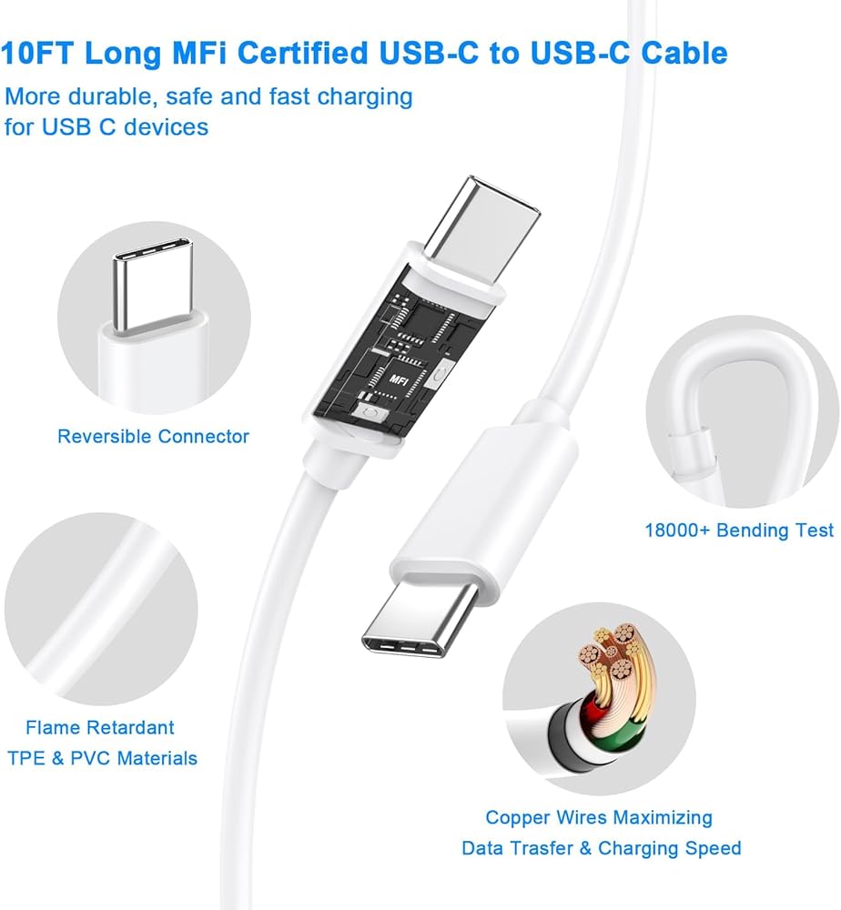 The 10FT iPhone 16 15 fast charger usb c cable is ideal for varied occasions, you can use your devices while charging with an adapter in your bedroom, kitchen, and in the backseat of your car.