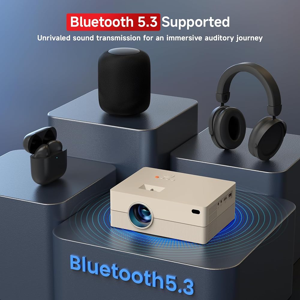 【WiFi Connection & Bluetooth 5.3】The projector with wifi and bluetooth is equipped with 2.4G + 5G dual-band WiFi connection, no need for cables, directly connect to IOS, Android, or Windows devices via WiFi to enter wireless projection mode. In addition to the built-in upgraded speakers, this smart projector also features Bluetooth 5.3 technology, allowing you to instantly wirelessly connect to your favorite Bluetooth headphones or speakers for faster and more stable audio synchronization. Please note: Bluetooth does not support connections to smartphones.