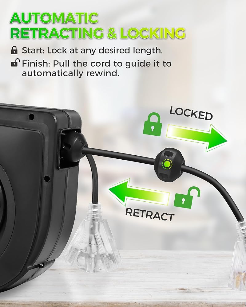 SJTOW Cord: This cord reel is UL-listed and equipped with a high strength SJTOW cord that offers excellent oil and water resistance. Its exceptional weather resistance ensures flexibility in ultra-high and ultra-low temperatures