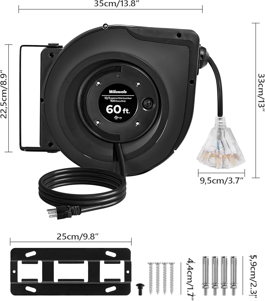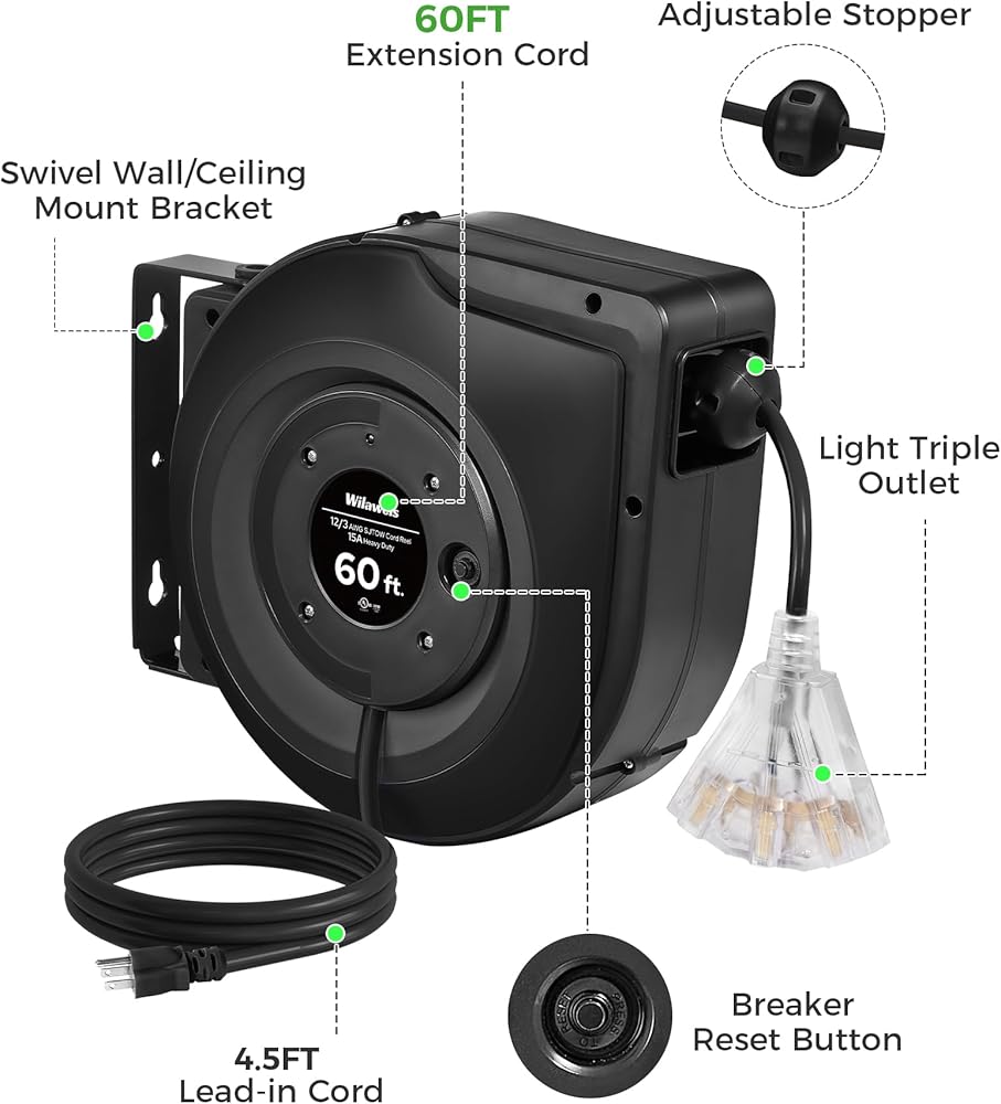 60FT 12/3C Gauge Cord: The 12AWG cord reel has a power rating of 15A/125V/1875W. With a retractable extension cord extends up to 60ft and a 4.5ft lead-in cord, it offers versatility for various power needs and is ideal for garages, studios and warehouses