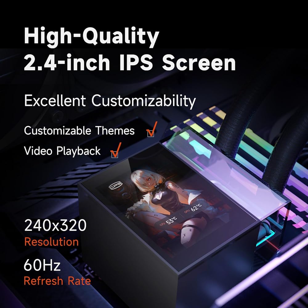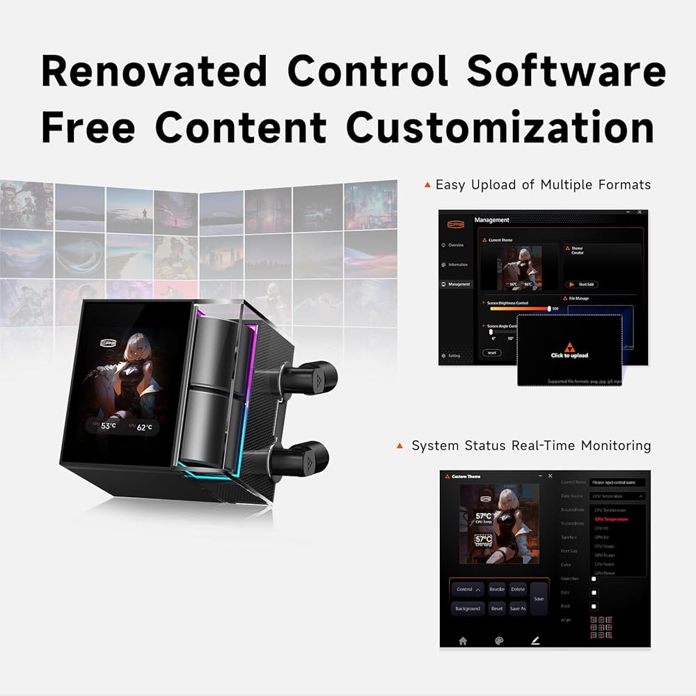 【Brilliant LCD Display & All-Round Temperature Control】DS360 360mm Liquid CPU Cooler, showcase your real-time CPU temperature, Beautiful design, the internal structure of the high transparency panoramic window is fully visible, with a small "sunroof" inside your pc case, mysterious and noble through the transparent lid.Excellent dual pumps must be paired with outstanding radiator.DS360 liquid cooler has a 396mm long, 27mm thick radiator, it tightly lined with aluminum fins, collocation with 3 Packs CPS F5 R120 120mm powerful cooling fans, can quickly take away the heat generated by the CPU.
