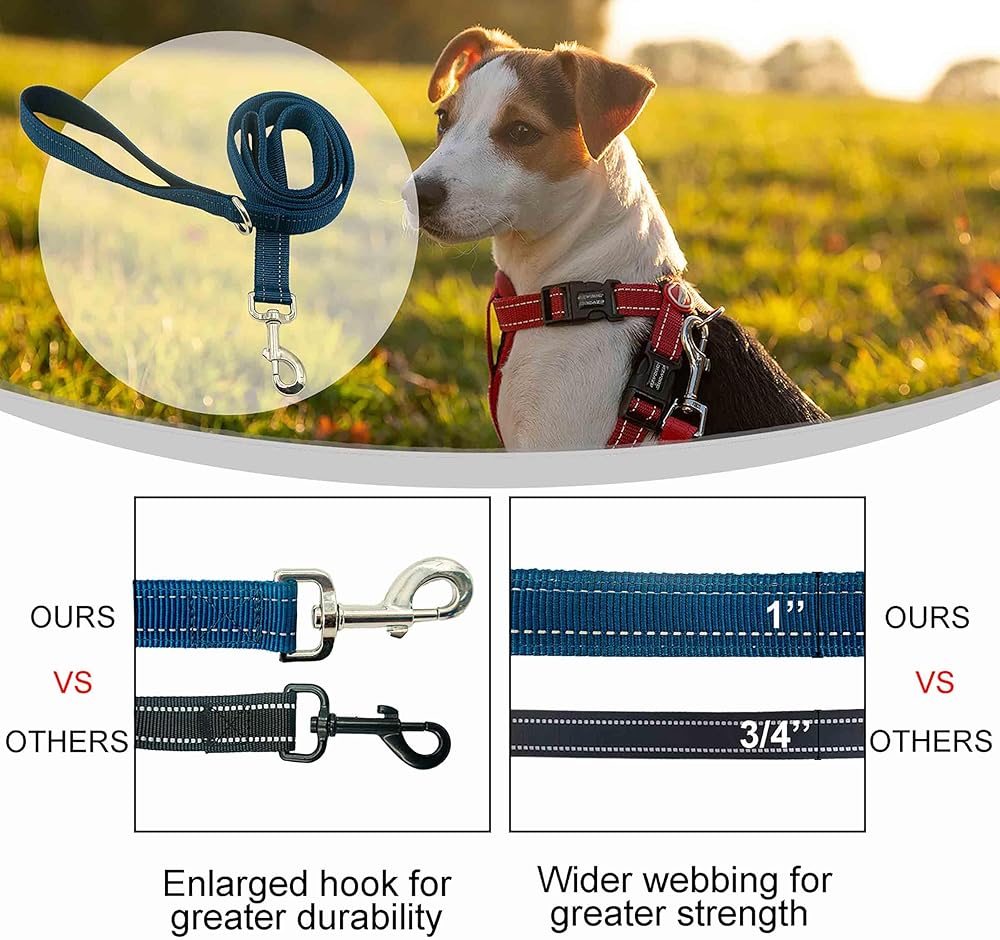 Premium Quality and Durability: This leash is 1Inch wide and comes in 4ft, 5ft and 6 ft lengths in black, red, pink and blue colors. It is made of high quality nylon that is strong and durable.Cross stitching is used on each articulated part of the D-ring fastening and double handle section, it does not break easily even when pulled hard. The reinforced seams make it perfect for daily walks, training and outdoor adventures with your dog.
