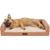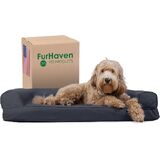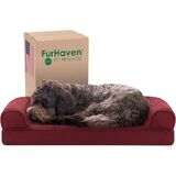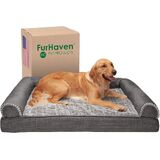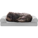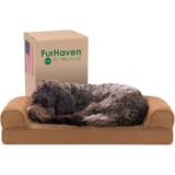 Perfect for pets young and old, the Furhaven Luxe Faux Fur & Performance Linen Sofa-Style Dog Bed is designed to provide your loved one with maximum comfort for a good night's rest. With a soft, plush embossed faux fur sleeping surface your pet will be more snug than a bug in a rug! The medical-grade foam core includes a layered orthopedic foam core topped with gel-infused memory foam. Micro gel beads help keep the bed cooler while memory foam conforms to your pet's shape providing superior support of joints and pressure points. Gel foam has cooling properties reducing the sleeping surface by 1- or 2-degrees, wicking heat away from your pet. The superior support provided by both foam cores will help your pet reach a deeper, more restorative rest for your pet's health. These are the perfect dog beds for hot summer days. They'll love the linen bolsters' soft but supportive feel provided on three sides giving them a variety of cozy positions to snuggle into. The bolsters are a great pillow for your pet to lie their head on or, for pets that like to cozy into your couch, they can snuggle close to the sides for a sense of security and warmth. Whatever position your pooch likes to lay in, they'll find nothing but comfort and sweet dreams! With the feel of a couch, your pet will love having their own space to curl into while you'll love having your favorite spot on the couch back! No more unwanted pet fur and scratches on your furniture. It's great for older pets who may be unable to jump on the couch and have had to lie on the floor. Easy to clean. Cover care: Remove from core before washing (see seam label for fabric care instructions). Foam care: Cooling gel foam is highly absorbent. Spot clean with mild soap or enzyme-based cleaning spray. Rinse but DO NOT SOAK OR SUBMERGE. Press out moisture with a dry towel and air dry. A fan may be used to speed drying. Do not wring or place in machine dryer. Dry completely before use. Not for unsupervised use by animals with destructive chewing behavior.