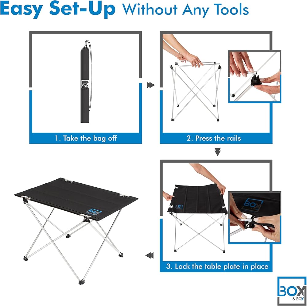 EASY TO ASSEMBLE - NO TOOLS NEEDED: Very easy to set up, just pop up aluminum X-shaped frame and attach table top in seconds! Will be your favorite camping accessories with easy and robust connection!
