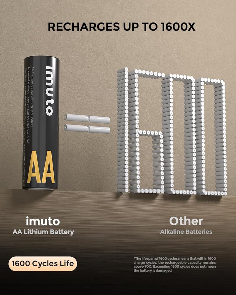 【1200 CYCLE LIFE】imuto AA rechargeable lithium batteries has an amazing cycle life of up to 1200 charging cycles with no memory effect. Can effectively reduce your battery costs and carbon footprint.